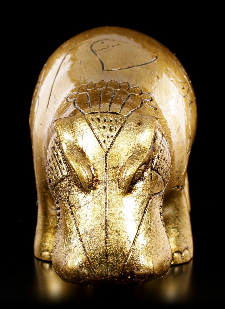 Angelehnt an die ägyptische Grabbeilage aus Mair, dem Fayence-Nilpferd Hippopotamus William, ist diese umwerfende Nilpferd Figur aus handbemaltem Kunststein entstanden. Das mit foralen Muster verzierte, goldfarbene Tier ist as der Serie Ancient Egypt.
