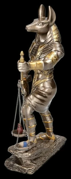 Edel bronzefarben ist diese schöne 26 cm hohe, 7 cm breite und 15 cm tiefe Figur des altägyptischen Gottes Anubis. In der altägyptischen Mythologie wurde Anubis als Gott der Totenriten und Einbalsamierung verehrt und eine der wichtigsten Aufgaben des schakalköpfigen Gottes war die Überwachung des Wiegens der Seele. Sein Urteil war dabei von entscheidender Bedeutung. Mit der Waage in der linken Hand und die rechte Hand auf dem Schwert scheint Anubis kurz davor zu sein, das Urteil über den Toten zu fällen. In der einen Waagschale ruht dazu ein Herz. Die faszinierende Anubis-Figur mit der Waage wurde aus sorgfältig handbemaltem Kunststein (Polyresin) gefertigt und ist ein perfektes Geschenk für jeden, der sich für die altägyptische Geschichte interessiert. Die Waage ist zum Schrauben.