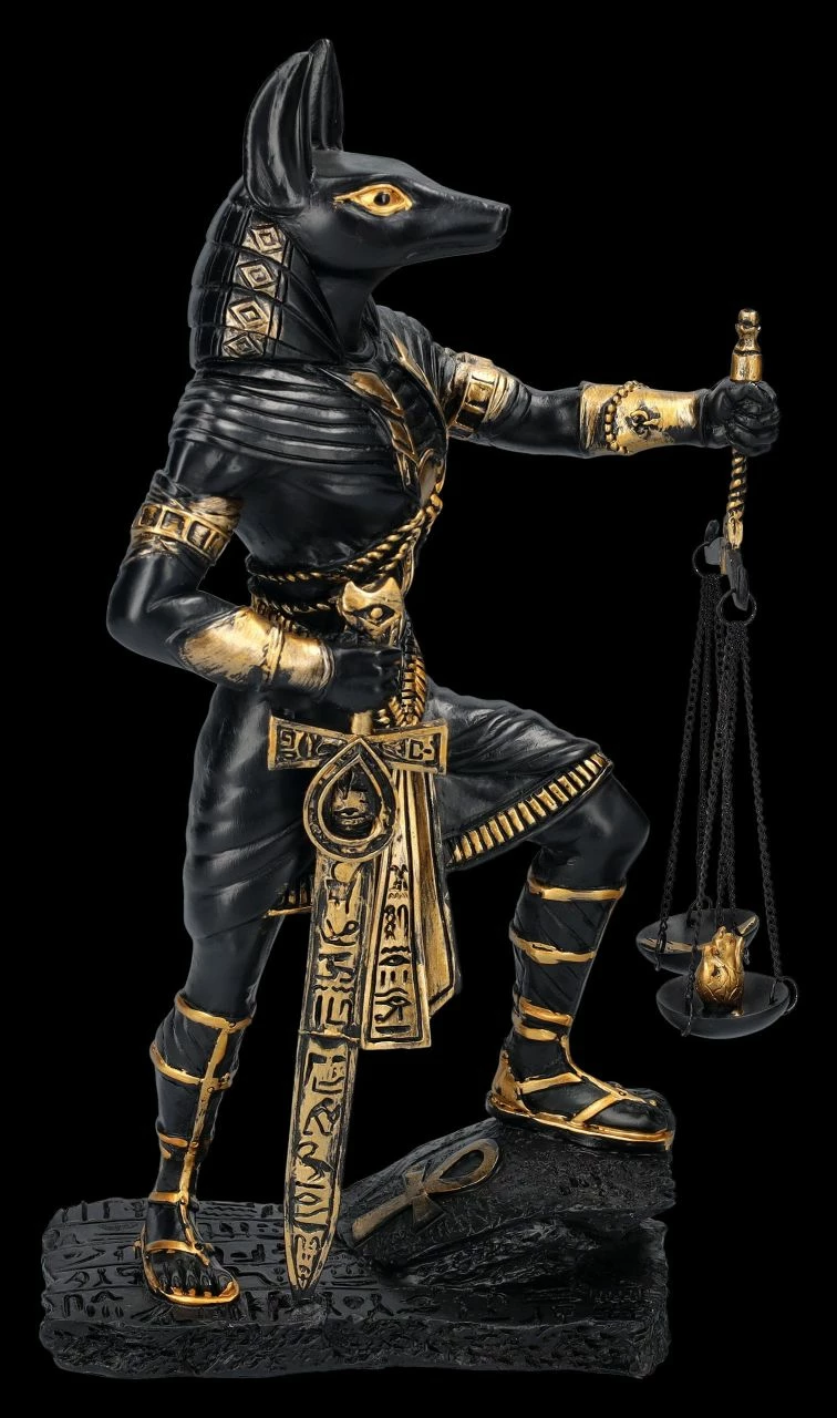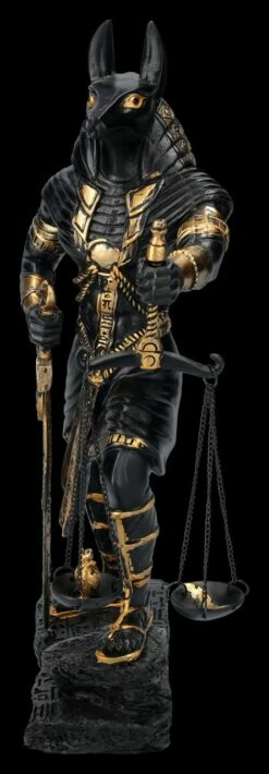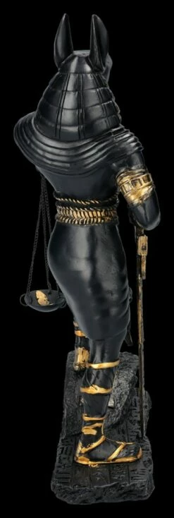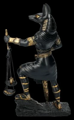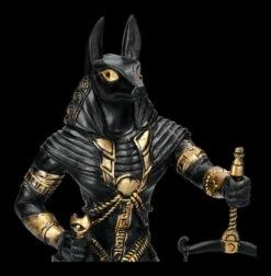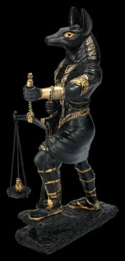 In der altägyptischen Mythologie wurde Anubis als Gott der Totenriten und Einbalsamierung verehrt. Eine der wichtigsten Aufgaben des schakalköpfigen Gottes war die Überwachung des Wiegens der Seele und sein Urteil war dabei von entscheidender Bedeutung. Diese schöne 26 cm hohe, 7 cm breite und 15 cm tiefe Figur zeigt Anubis mit der Waage in der linken Hand, während seine rechte Hand auf dem Schwert ruht. Anubis scheint kurz davor zu sein, das Urteil über den Toten zu fällen. Die schwarze Anubis-Figur mit derr Waage wurde mjit bronzefarbenen Akzenten aus handbemaltem Kunststein (Polyresin) gefertigt und ist auch ein wunderbares Geschenk für jeden, der sich für die altägyptische Geschichte interessiert. Die Waage ist zum Schrauben.