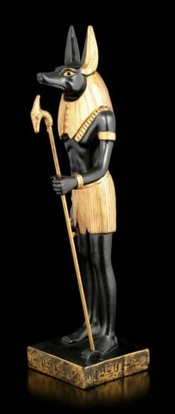 Detailreiche stehende Anubis Figur aus handbemaltem Kunststein. Die schwarze Figur wird durch die goldenen Akzente zu einem richtigen Highlight in Ihrer Sammlung.