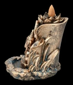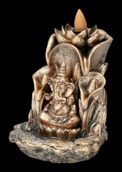 Die elefantenköpfige Gottheit Ganesha ist mittlerweile nicht nur im Hinduismus und Buddhismus beliebt. Schließlich steht Ganesha für die vier wichtigsten Aspekte, wie Geist, Intellekt, Bewusstsein, aber auch Ego. Ganesha, der bei diesem fantastischen Backflow Räucherhalter im Schneidersitz auf einem Thron aus Lotusblüten sitzt, steht auch besonders für einen guten Beginn, für die Überwindung von Hindernissen, aber auch für das Genießen der schönen Seiten des Lebens. Die Lotusblume selbst wird im Buddhismus als ‚Heilige Blume‘ bezeichnet. Wenn der Räucherkegel bei diesem faszinierenden Backflow Räucherhalter in der obersten Lotusblüte brennt, fließt der Rauch meditativ wie leichter, geheimnisvoller Nebel nach unten. Der 14 cm hohe, 11 cm breite und 14,5 cm tiefe Backflow-Räucherhalter mit Ganesha auf dem Thron aus Lotusblüten wurde detailreich aus bronzefarben handbemaltem Kunststein (Polyresin) gefertigt. Der schöne Räucherhalter ist nicht nur ein dekoratives Accessoire für jeden Meditationsraum, sondern als Glücksbringer auch ein schönes Geschenk. Passende Räucherkegel gibt es in unserem Shop. Bei der Verwendung des Räucherkegelhalters bitte unbedingt unsere Sicherheitshinweise beachten.