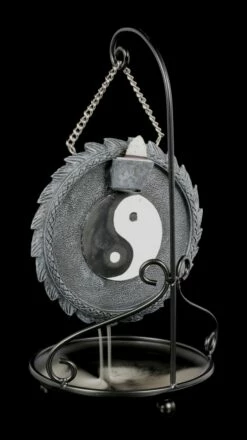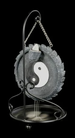 Wie ein großer mystischer Gong schaut der tolle Backflow Räucherkegelhalter Yin Yang aus. Einer der reliefartigen Drachen auf der Scheibe hat sein Maul weit aufgerissen und der Rauch des Backflow Kegels kann so ungehindert wie ein Wasserfall nach unten in die Auffangschale fallen. Der handbemalte Räucherkegelhalter aus Kunststein (Polyresin) wird sicher ein dekoratives Element in Ihrer Wohnung.