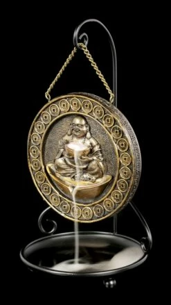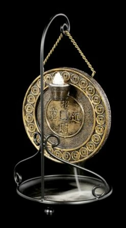 Der edle goldfarbene Backflow Räucherkegelhalter in Form eines Gongs wir Sie begeistern. Der Rauch des Räucherkegels fließt aus dem Korb des Buddhas nach unten in die Auffangschale. Gerade als Zusatzelement für einen Zen Garten ist der Backflow Räucherkegelhalter aus handbemaltem Kunststein (Polyresin) einfach perfekt.