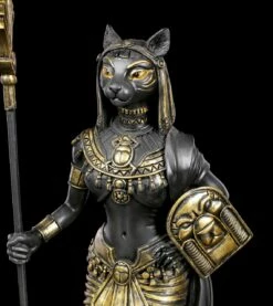 Diese altägyptische Katzengöttin Bastet wird Sie begeistern. Der Unterleib der Katze ist ein Schlangenkörper mit goldenen Schuppen. Bastet hält einen Stab in der rechten Hand und ein Schild am linken Arm. Die ausgefallene Darstellung der altägyptischen Göttin der Fruchtbarkeit und der Liebe wird jeden Ägypten Liebhaber begeistern. Die Götterfigur wurde detailreich aus handbemaltem Kunststein (Polyresin) gefertigt und wird zum sofortigen Blickfang in jedem Ambiente.