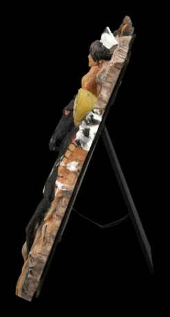 Die wilde Herde mit den jungen Pferden scheint von dem reitenden Indianer gerade eingefangen worden und soll nun in die Koppel getrieben werden. Mit den vielen Details kann das Foto der eigenen Pferde in dem 19 cm hohen, 26 cm breiten und 2 cm tiefen Bilderrahmen perfekt umrahmt werden. In dem Rahmen hat hinter Glas ein Foto mit der Bildgröße von 10 x 15 cm Platz. Der Western-Bilderrahmen mit Pferden ist zum Stellen und wurde plastisch und sehr detailreich aus handbemaltem Kunststein (Polyresin) gefertigt. Mit dem passenden Foto ist er auch ein perfektes Geschenk für Indianer- und Western-Fans.