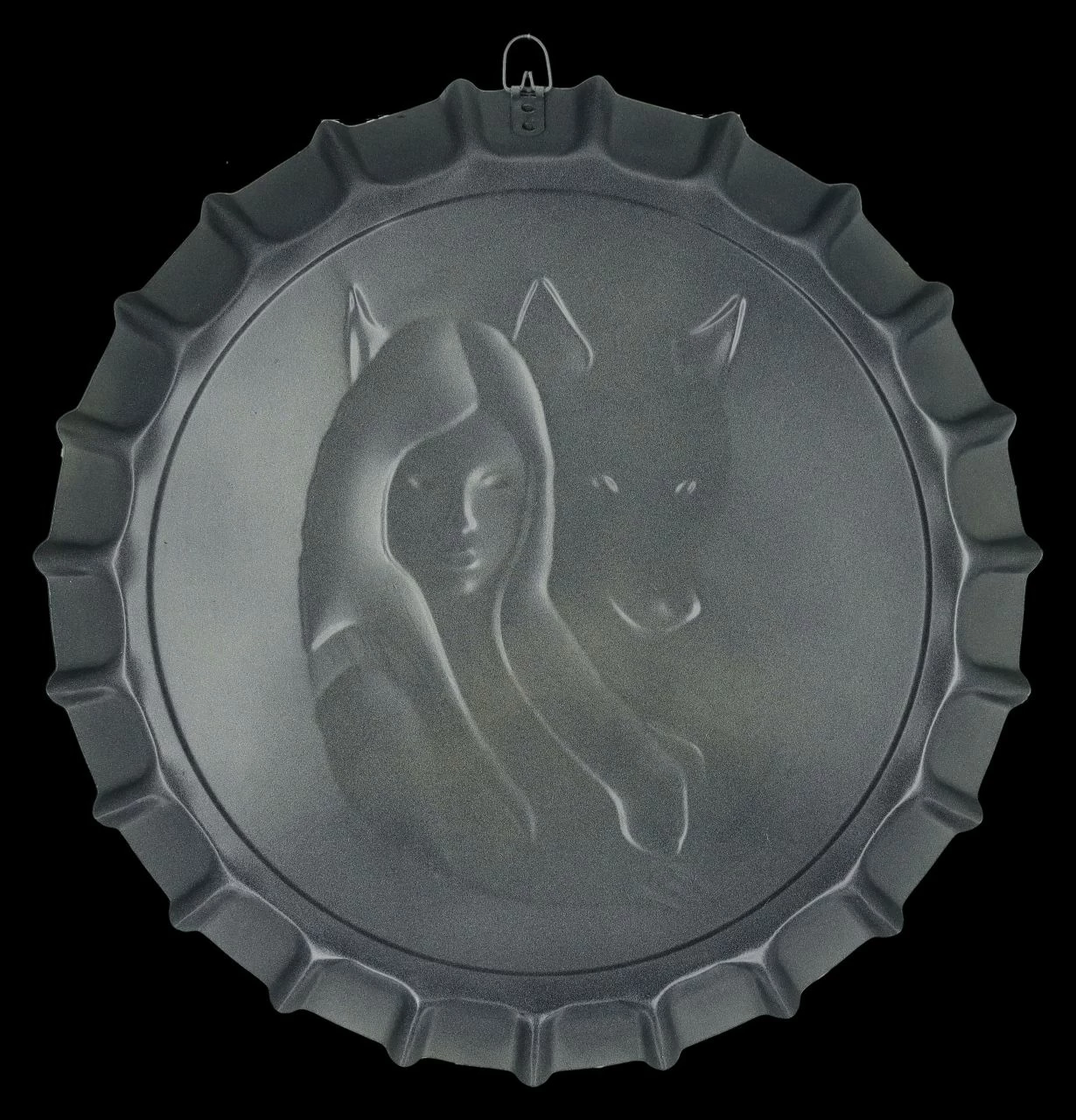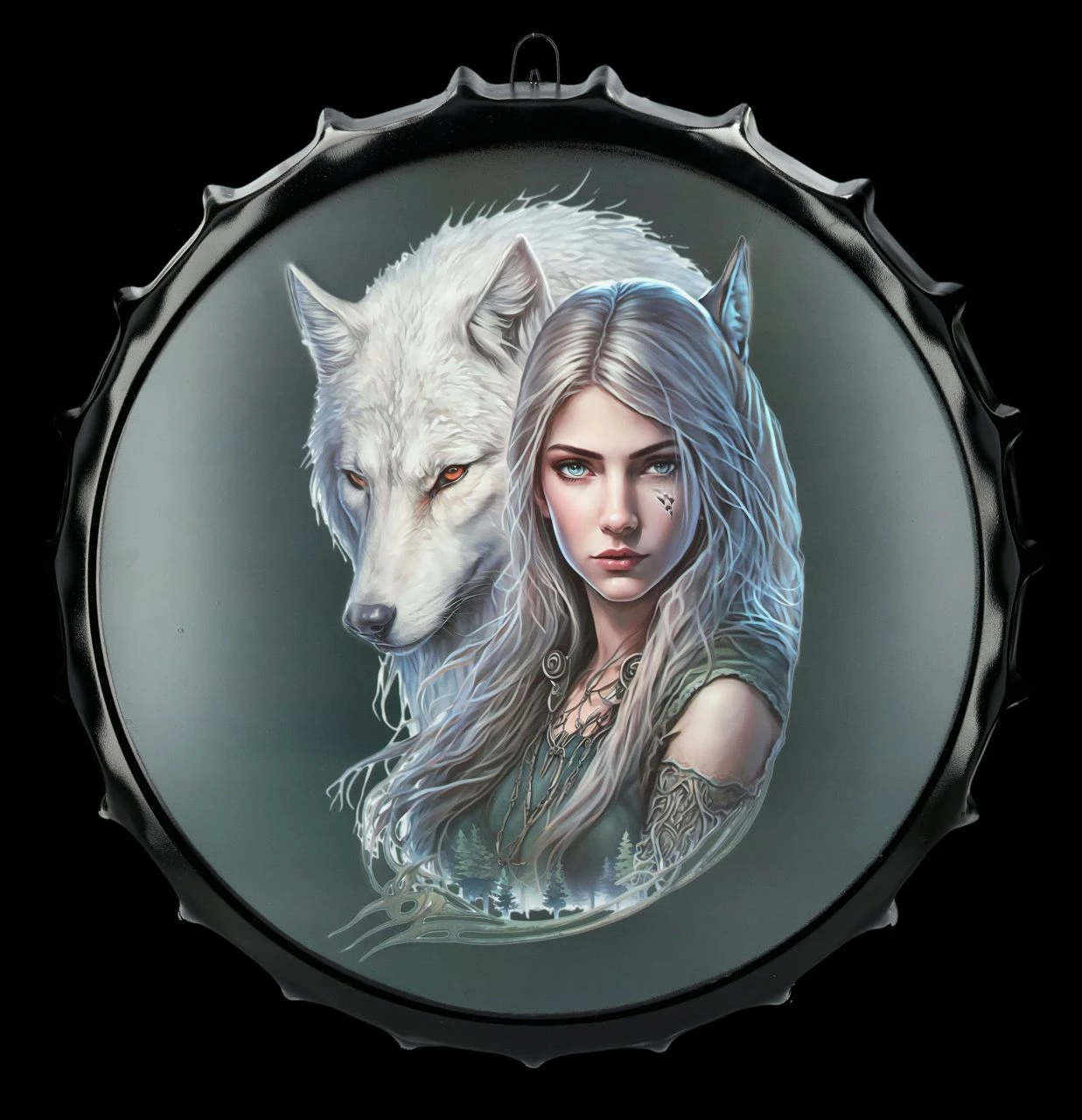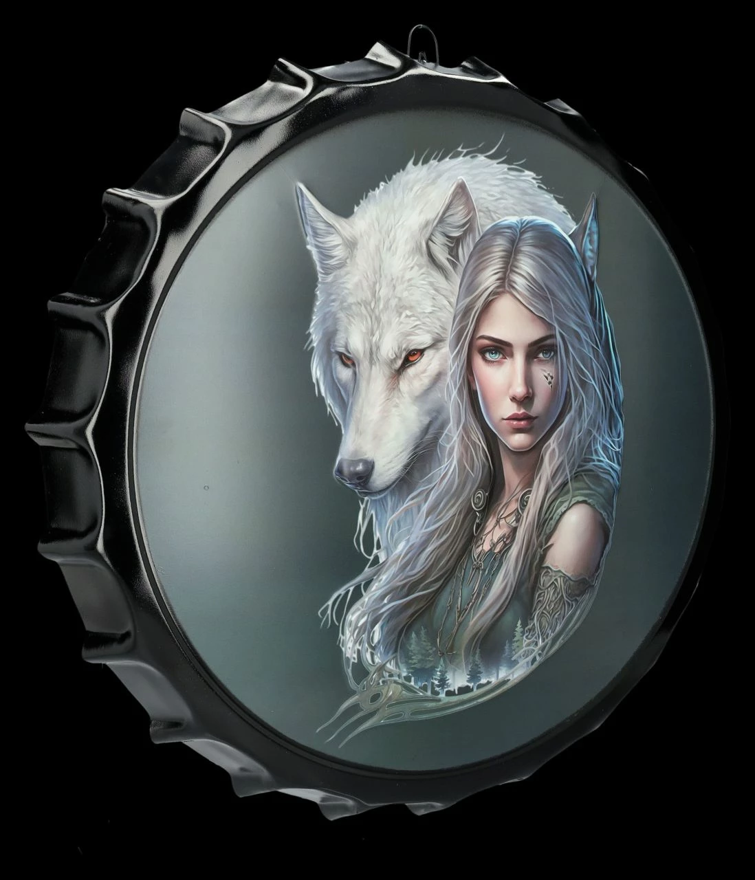 Ist das nicht eine wunderbar magische Deko für die Bar oder das Esszimmer zu Hause? Die schöne Wolf Prinzessin und ihr treuer Begleiter, der prächtige weiße Wolf blicken jeden herausfordernd an. Das herrliche, 42 cm hohe, 42 cm breite und 4,5 cm tiefe Blechschild zum Hängen wirkt wie ein riesiger Kronkorken, auf dem die schöne Prinzessin mit ihrem Wolf abgebildet ist. Das Metallschild mit der geheimnisvollen Wolf Prinzessin ist – vielleicht gleich gemeinsam mit einem der anderen fantastischen Blechschilder aus unserem Shop – auch für Sammler ein perfektes Geschenk.