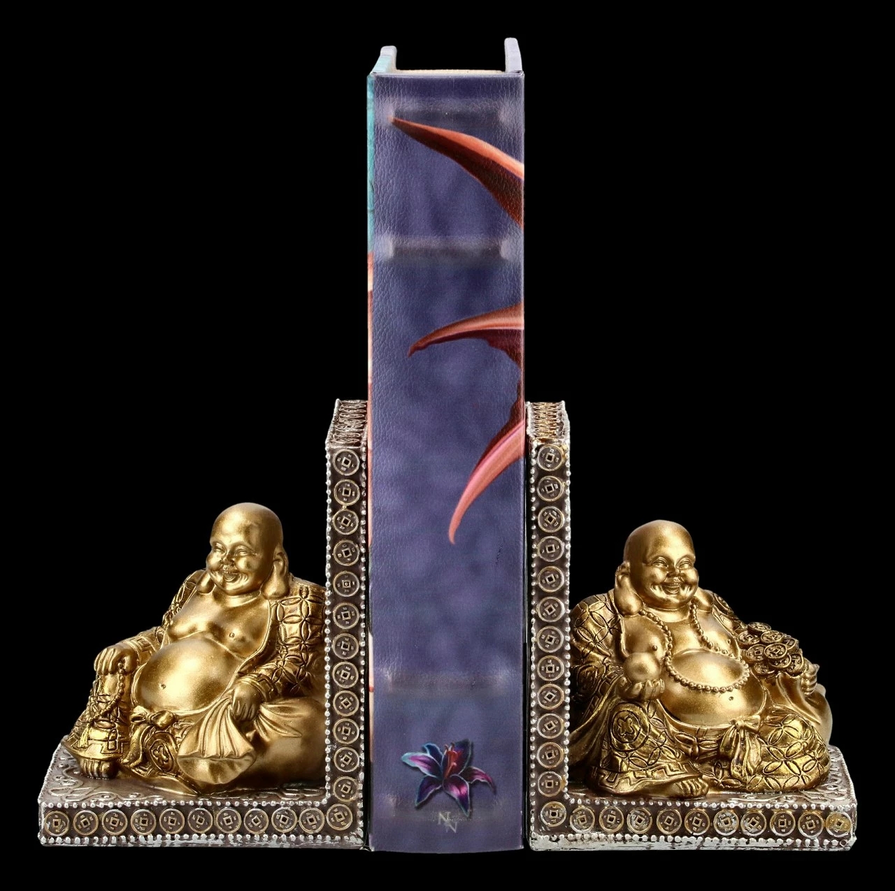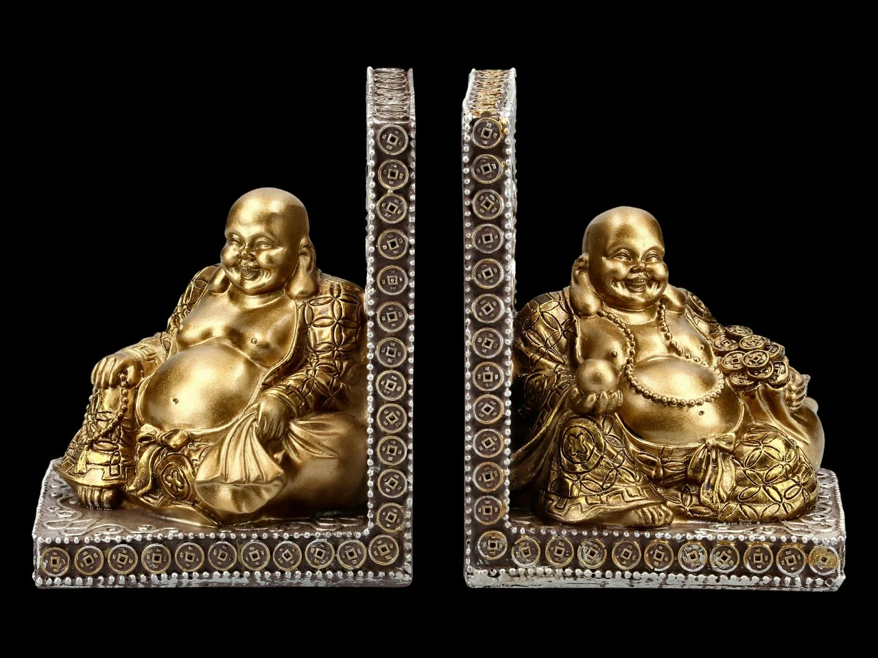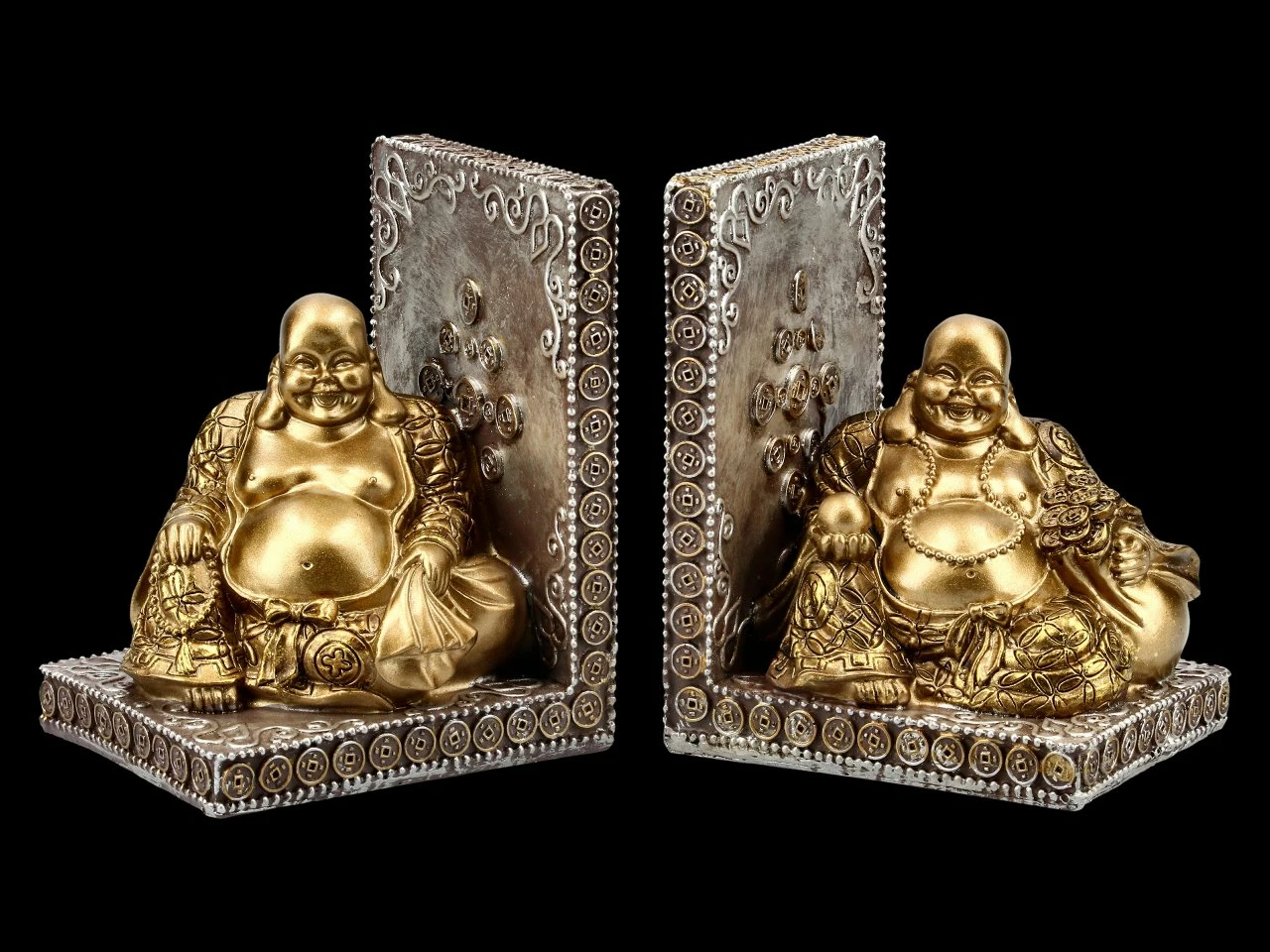 Glücklich und zufrieden schauen diese beiden lachenden Buddhafiguren auf den dekorativen Buchstützen aus. Die schönen Buchstützen mit den beiden goldfarbenen Happy Buddha Figuren ist sehr detailreich aus Kunststein (Polyresin) gefertigt und handbemalt. Die Buchstützen haben eine Höhe von je 14 cm, eine Breite von je 9,5 cm und eine Tiefe von je 11,5 cm. Tolle und dekorative Buchstützen, bei denen die glückliche Ausstrahlung der beiden Buddhafiguren sicher auf jeden Betrachter übergeht.