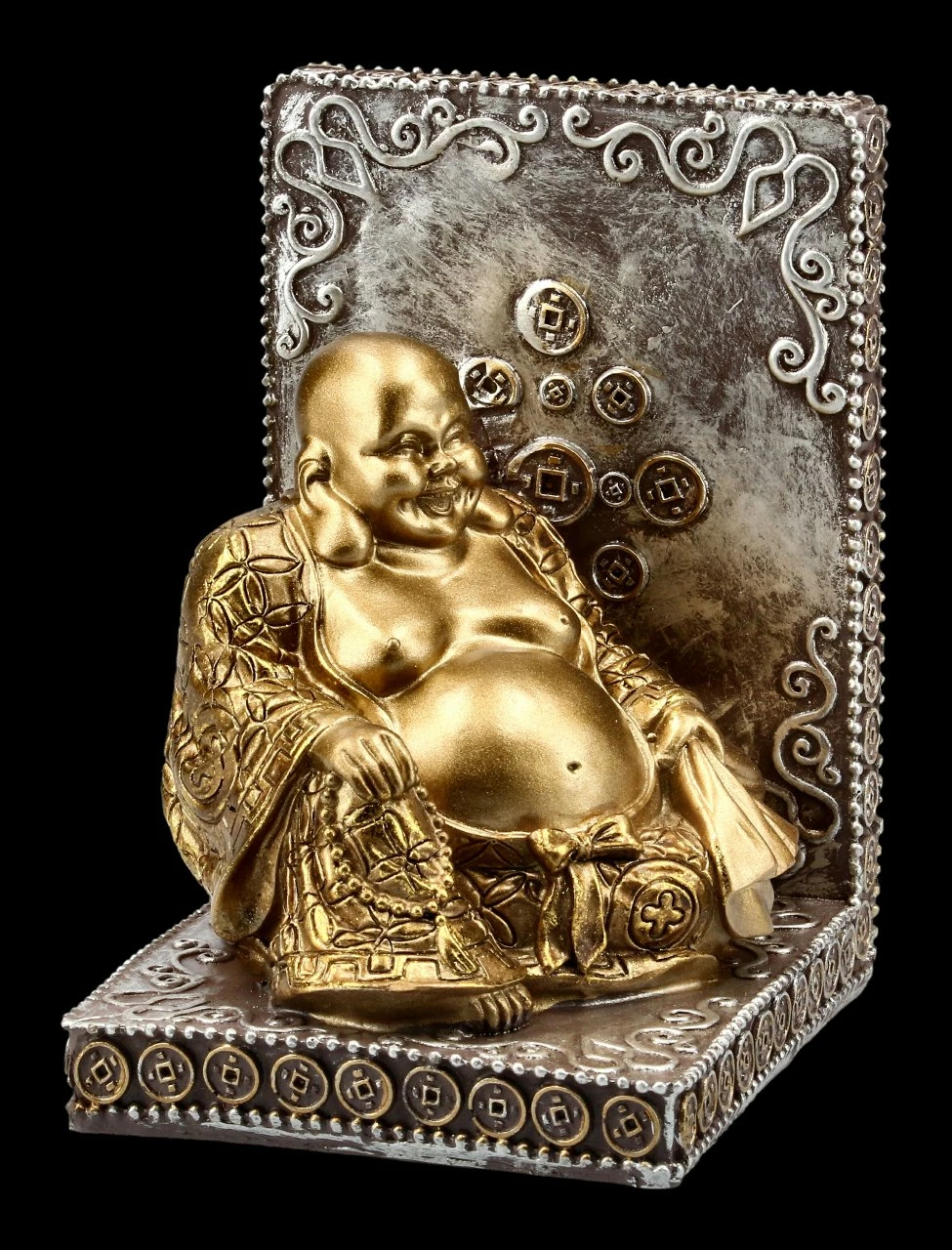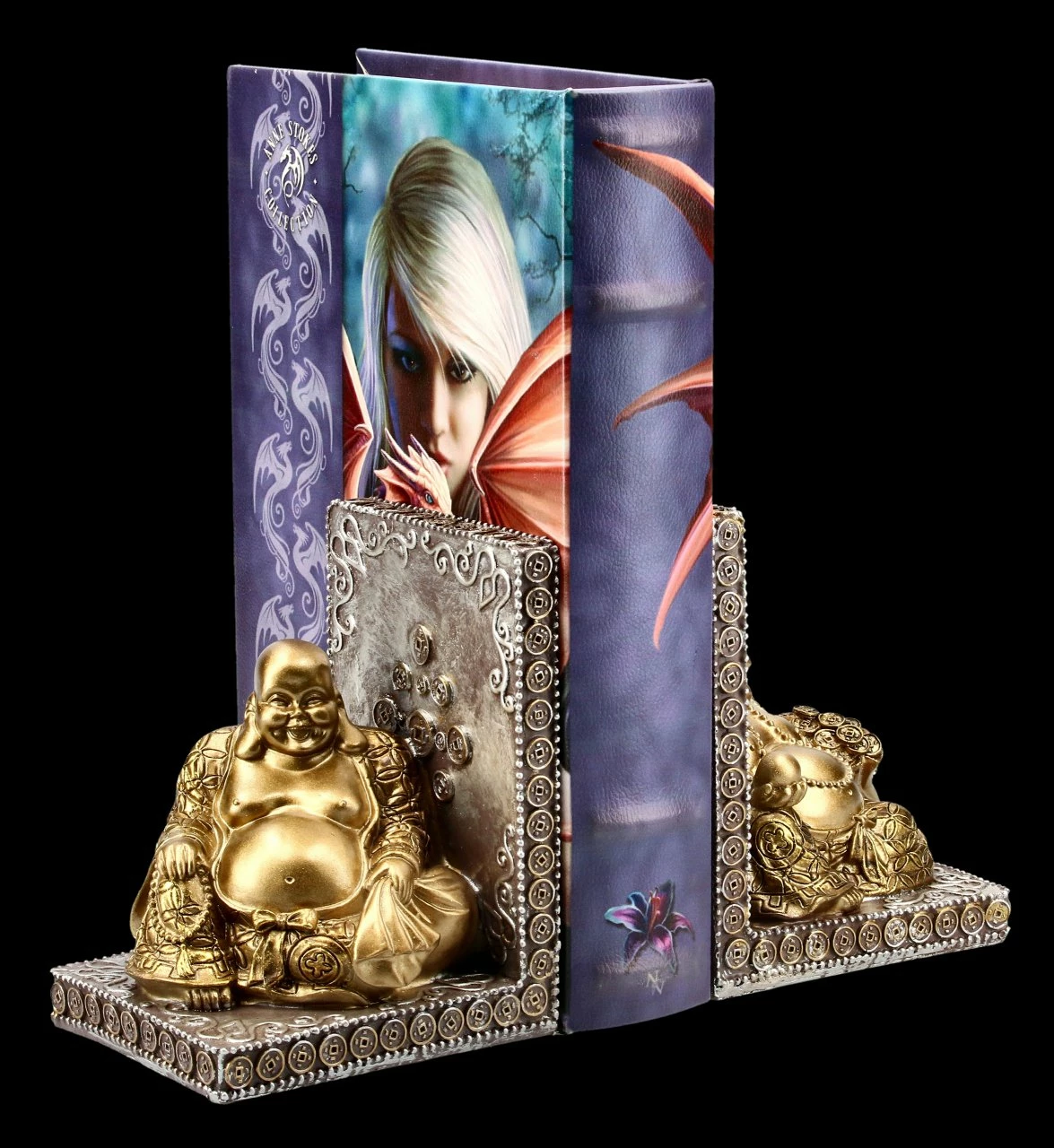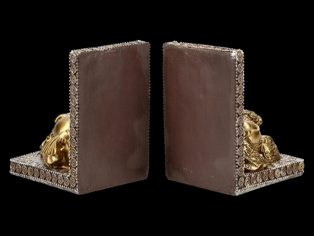 Glücklich und zufrieden schauen diese beiden lachenden Buddhafiguren auf den dekorativen Buchstützen aus. Die schönen Buchstützen mit den beiden goldfarbenen Happy Buddha Figuren ist sehr detailreich aus Kunststein (Polyresin) gefertigt und handbemalt. Die Buchstützen haben eine Höhe von je 14 cm, eine Breite von je 9,5 cm und eine Tiefe von je 11,5 cm. Tolle und dekorative Buchstützen, bei denen die glückliche Ausstrahlung der beiden Buddhafiguren sicher auf jeden Betrachter übergeht.