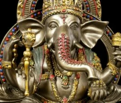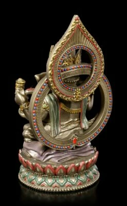 Diese kleine Altarstatue aus bronziertem und coloriertem Kunststein (Polyresin) stellt Ganesha dar. Der Elefantengott Ganesha ist im Hinduismus als Herr der Hindernisse sowohl der göttliche Beseitiger als auch der Setzer von Hindernissen. Die wunderschöne detailreiche Darstellung dieses Ganeshas auf dem Lotus Thron gibt jedem Bereich ein fantastisches orientalisches Flair und ist auch ein tolles Geschenk für einen lieben Menschen.
