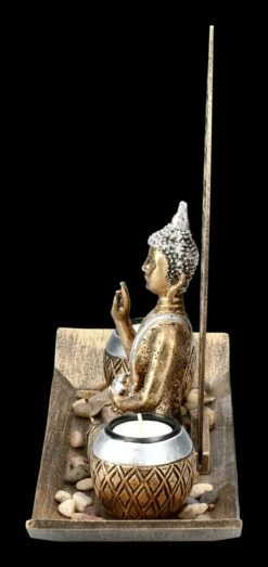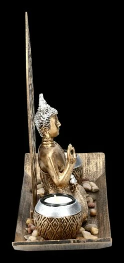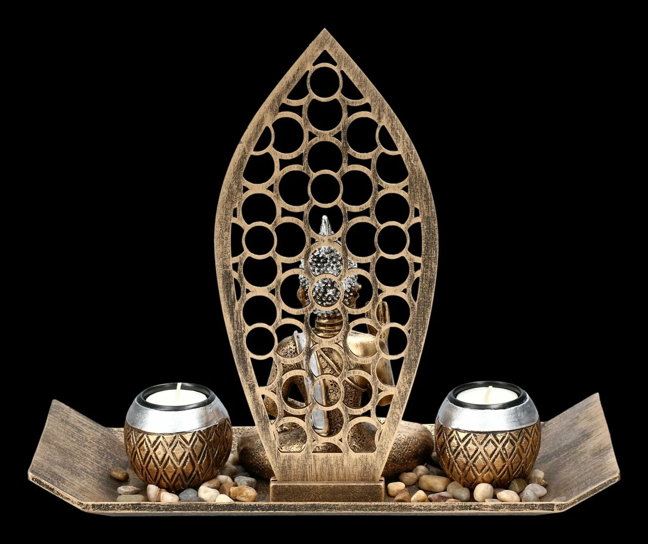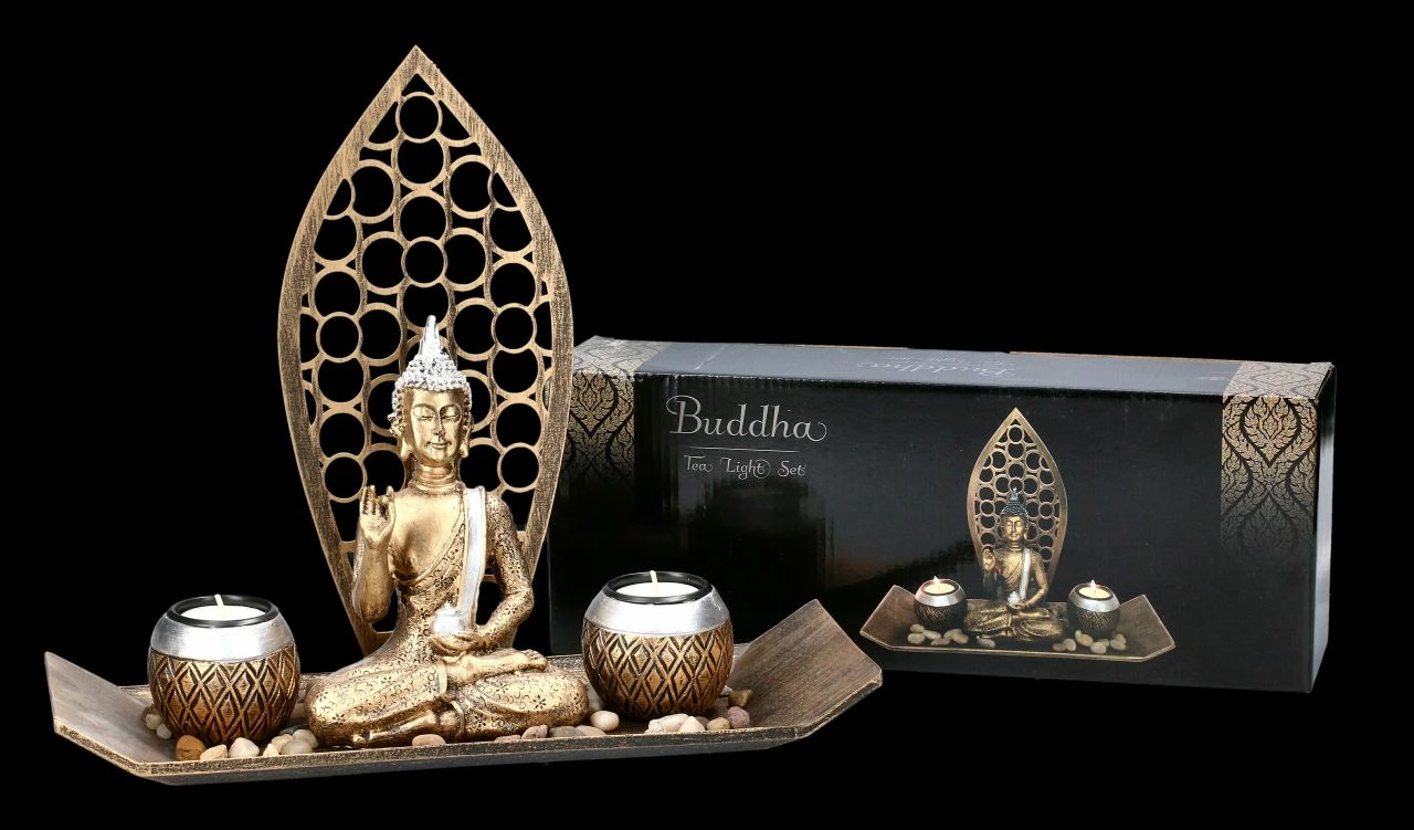 Ob auf dem Sideboard, der Fensterbank oder Ihrem persönlichen Altar, diese wunderschöne Buddha Figur mit den beiden Teelichthaltern in der Schale wird durch die sanfte Ausstrahlung die positiven Energien Ihres Zuhauses nicht nur bei der Meditation verstärken. Das 30 cm hohe, 35 cm breite und 13 cm tiefe Meditations Set mit den beiden Teelichthaltern ist sehr edel aus handbemaltem Kunststein (Polyresin) gefertigt. Die Schale mit den 2 Teelichthaltern und den Steinen ist 35 cm breit, 13 cm tief und hat eine Höhe von 3,5 cm. Ein edler Teelichthalter, der auch als wunderbares Geschenk geeignet ist und inklusive Geschenkkarton verschickt wird. Die beiden Teelichthalter und die Steine gehören zu dem Set, die Teelichter sind jedoch nicht inklusive.