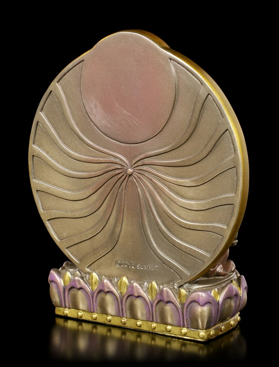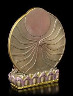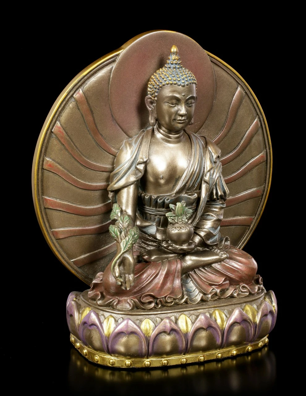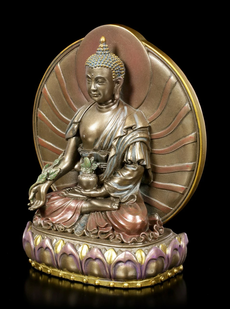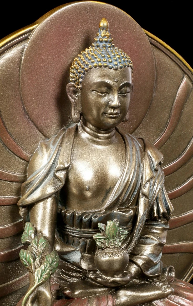 Diese wunderschöne, detailreiche bronzierte und colorierte Figur aus Kunststein (Polyresin) symbolisiert Bhaisajyaguru – den Medizin Buddha. Er wird immer mit etwas Blauem dargestellt. In seiner linken Hand hält er eine Schale mit Heilungsnektar und in der rechten Hand hält er einen Myrobalan-Zweig. Der Geburtstag dieses Buddhas wird am 30.09. gefeiert.