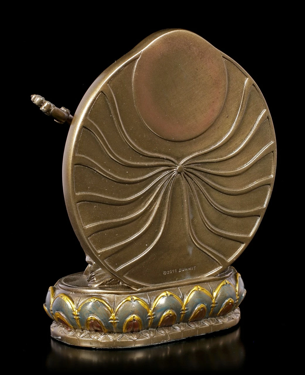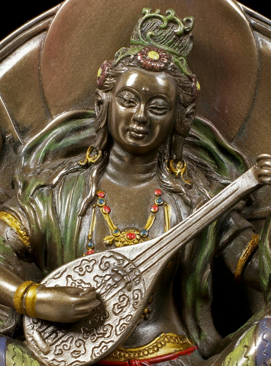 Sarasvati ist die indische Göttin der Weisheit und der Gelehrsamkeit. Sie ist eine der beliebtesten Gottheiten im Hinduismus. Bei dieser Darstellung spielt die Göttin auf einer Vina, ein gezupftes Seiteninstrument. Die Sarasvati Statuette ist aus bronziertem und coloriertem Kunststein (Polyresin).