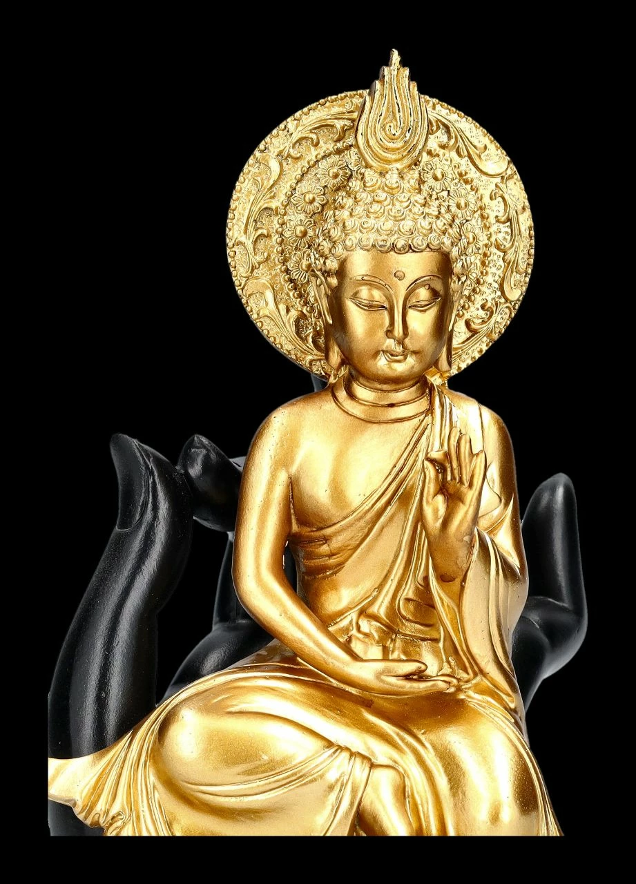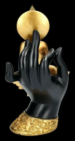 Auf dieser wunderbaren Buddha-Figur sitzt ein tief in seine Meditation versunkener goldener Buddha – wie auf einem Thron – auf einer schwarzen Hand. Während eine Hand in seinem Schoß liegt, zeigt er mit der anderen die Mudra-Geste der Bewegung des Dharma-Rades und symbolisiert die Lehre und steht für einen nicht enden wollenden Energiefluss. Die glänzend schwarze Hand hat einen goldenen Ärmelabschluss mit Verzierungen, der auch gleichzeitig den Sockel der fantastischen Buddha-Figur bildet. Sie zeigt dieselbe Mudra-Geste wie die Buddha-Figur. Die 24,5 cm hohe, 12 cm breite und 11 cm tiefe Buddha-Figur wurde aus sorgfältig handbemaltem Kunststein (Polyresin) gefertigt und wirkt ausgesprochen edel. Sie ist nicht nur eine symbolhafte Dekoration, sondern auch ein perfektes Geschenk für jeden, dem man den nicht enden wollenden Energiefluss wünscht.