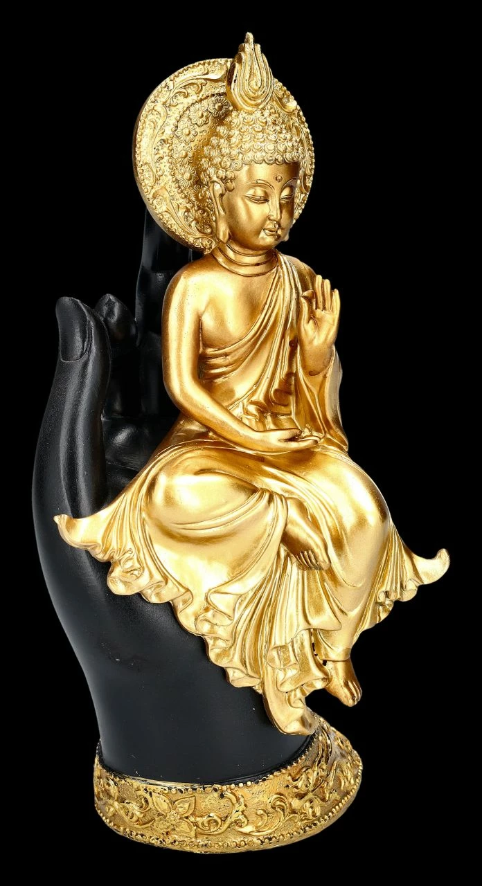 Goldfarbener Buddha sitzt auf schwarzer Hand