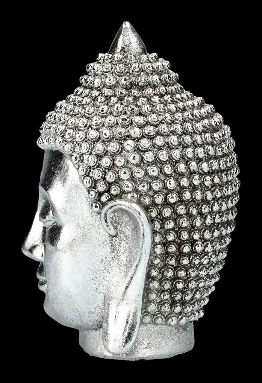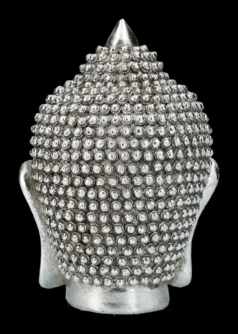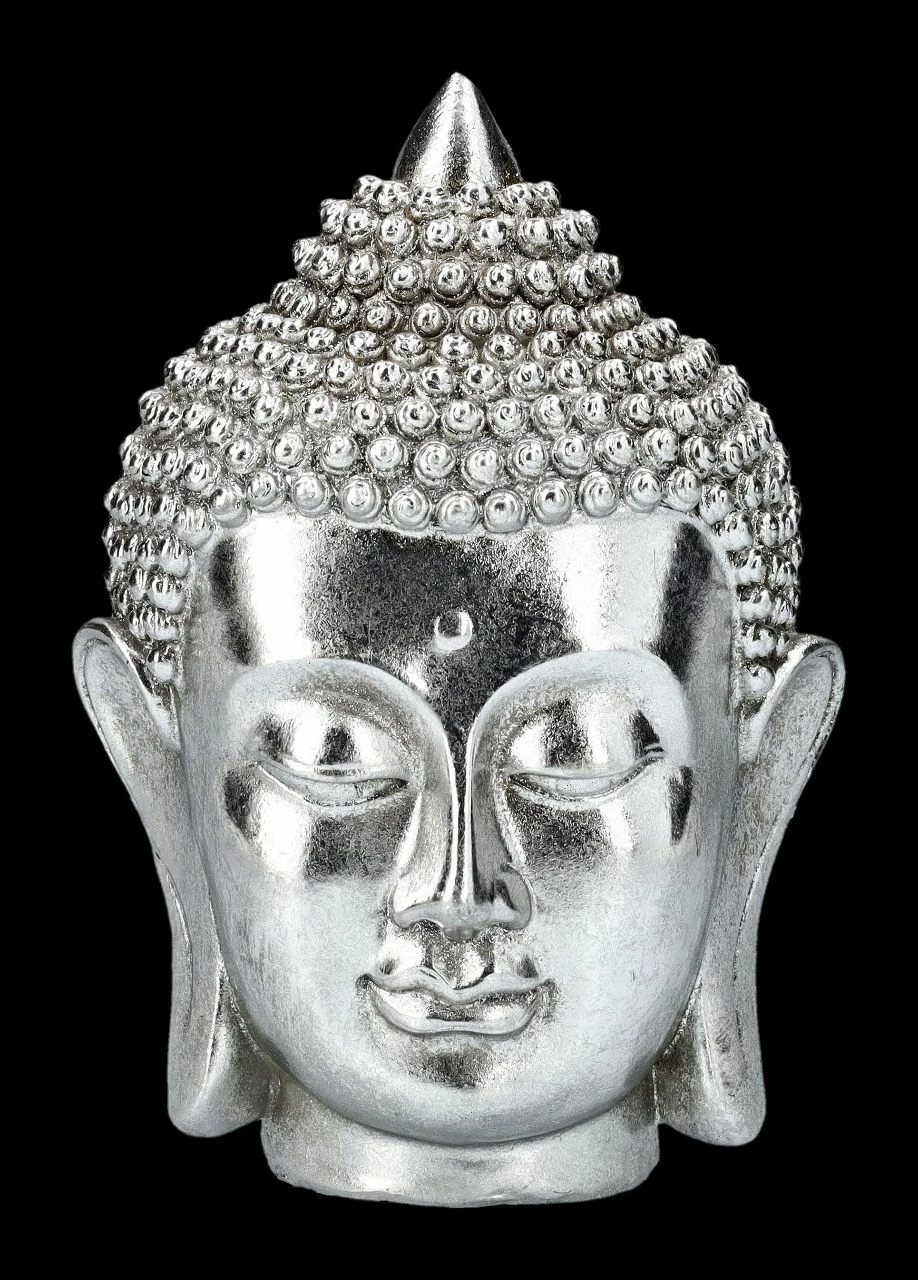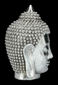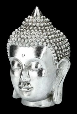 Der schöne von Hand in Antik-Silber-Farben bemalte Buddha-Kopf wurde aus Kunststein (Polyresin) gefertigt. Er ist 17 cm hoch, 11,5 cm breit und 11,5 cm tief. Er bringt nicht nur asiatisches Feeling in jedes Ambiente, die meditative Ruhe, die dieser schöne Buddha-Kopf ausstrahlt, wird sich auf jeden Betrachter übertragen. Er sollte einen schönen Platz in der Mitte eines Raumes bekommen, an dem er sofort gesehen wird.