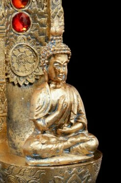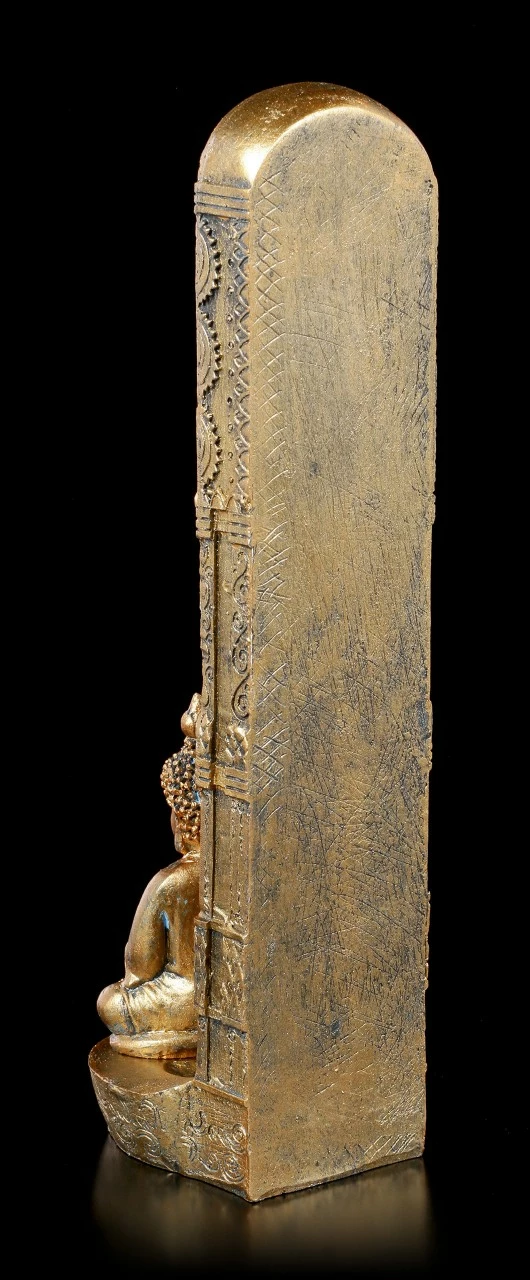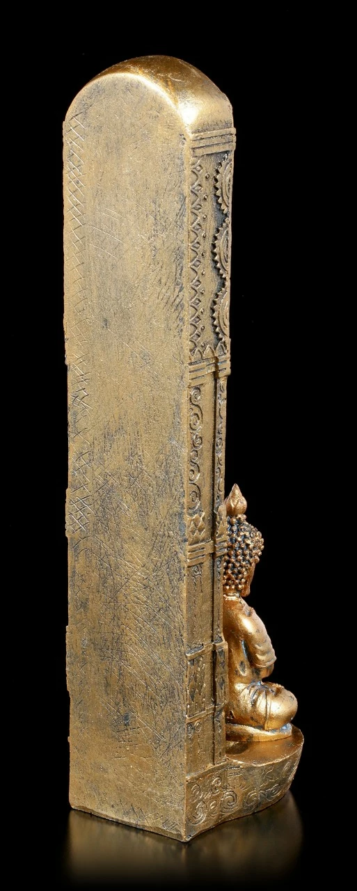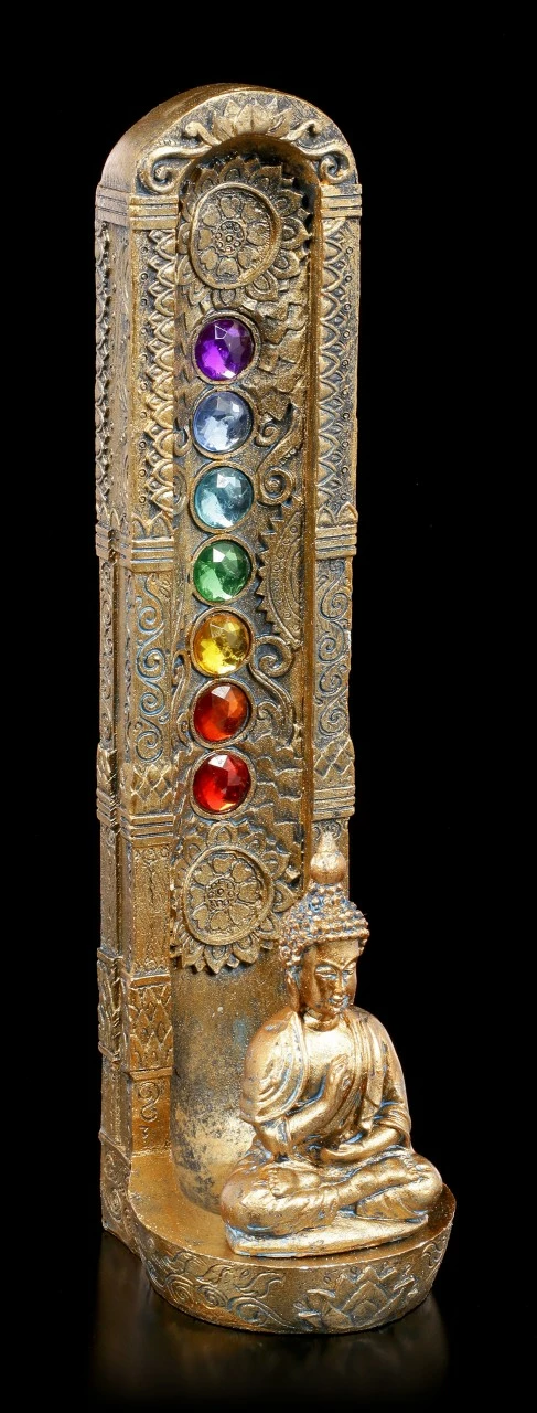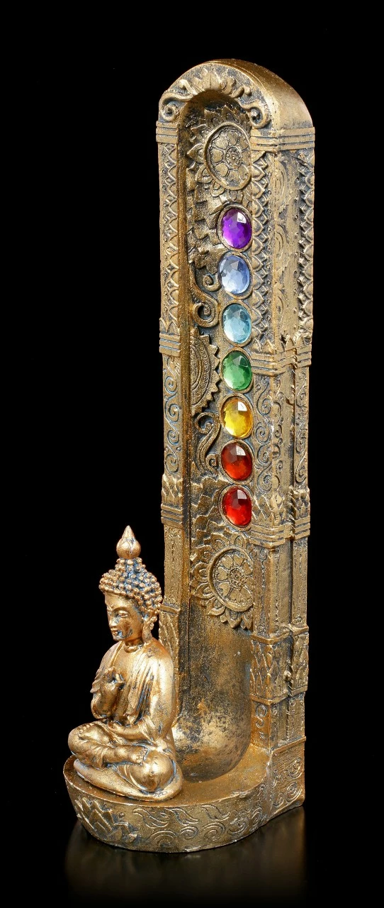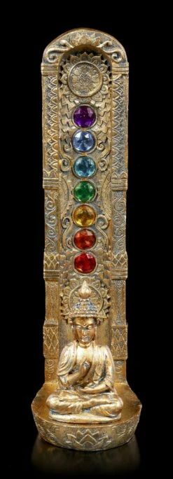 Ein goldener Buddha meditiert konzentriert vor einer goldenen verzierten Säule, in die die verschiedenen Chakra Kristalle eingefasst worden sind. Hinter den Buddha lässt sich ein wohlriechendes Räucherstäbchen anbringen. Der Duft wird Ihren Raum in eine Wohlfühloase verwandeln. Der mit Schmucksteinen verzierte Räucherstäbchenhalter Ascending Chakras wurde sorgsam aus handbemaltem Kunststein (Polyresin) gefertigt.