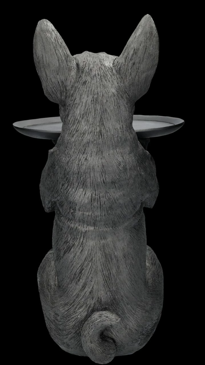 So stilgerecht wird man bei Bulldoggen-Freunden empfangen! Man weiß zwar, dass Bulldoggen sehr gelehrig sind, aber durchaus ihren eigenen Kopf haben, daher ist eine Bulldogge als Butler schon eine kleine Sensation. Diese schwarze Bulldogge sitzt auf den Hinterbeinen und hält in perfekter Haltung mit beiden Vorderpfoten eine 1 cm hohe, 29 cm breite und 31 cm tiefe Schale als Tablett hoch. Wenn man im Flur von diesem Butler empfangen wird, kann man zum Beispiel die Schlüssel auf das Tablett legen. Die beeindruckende, 50 cm hohe, 29 cm breite und 31 cm tiefe schwarze Bulldoggen-Figur ist aus sorgfältig handbemaltem hochwertigem Kunststein (Polyresin). Die Bulldogge als Butler ist doch ein perfektes Geschenk für alle Bulldoggen-Freunde…