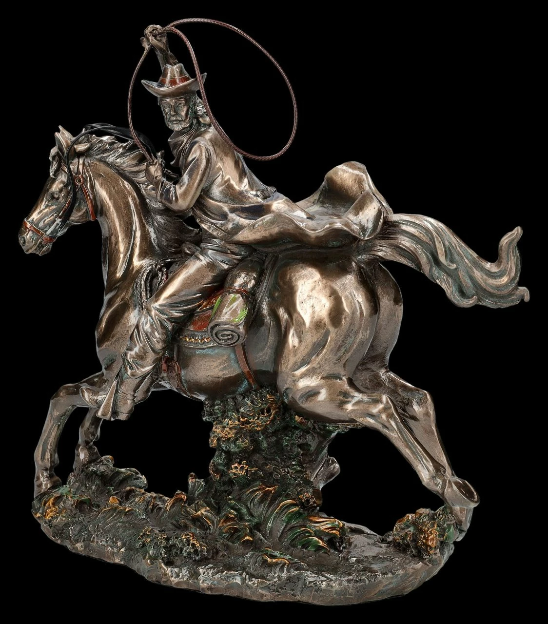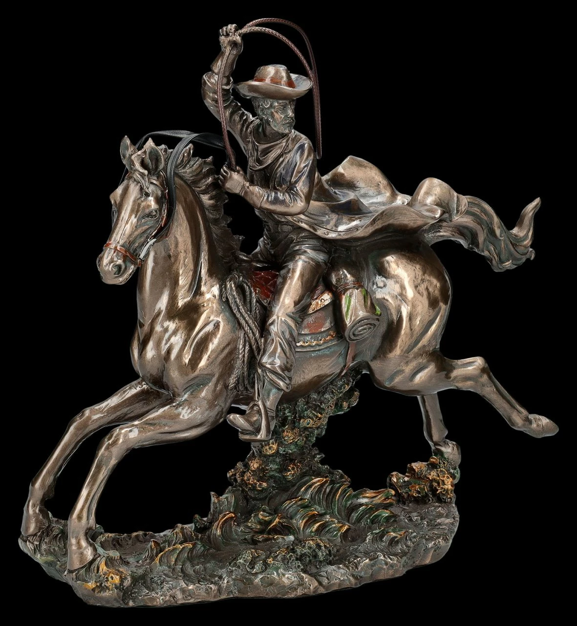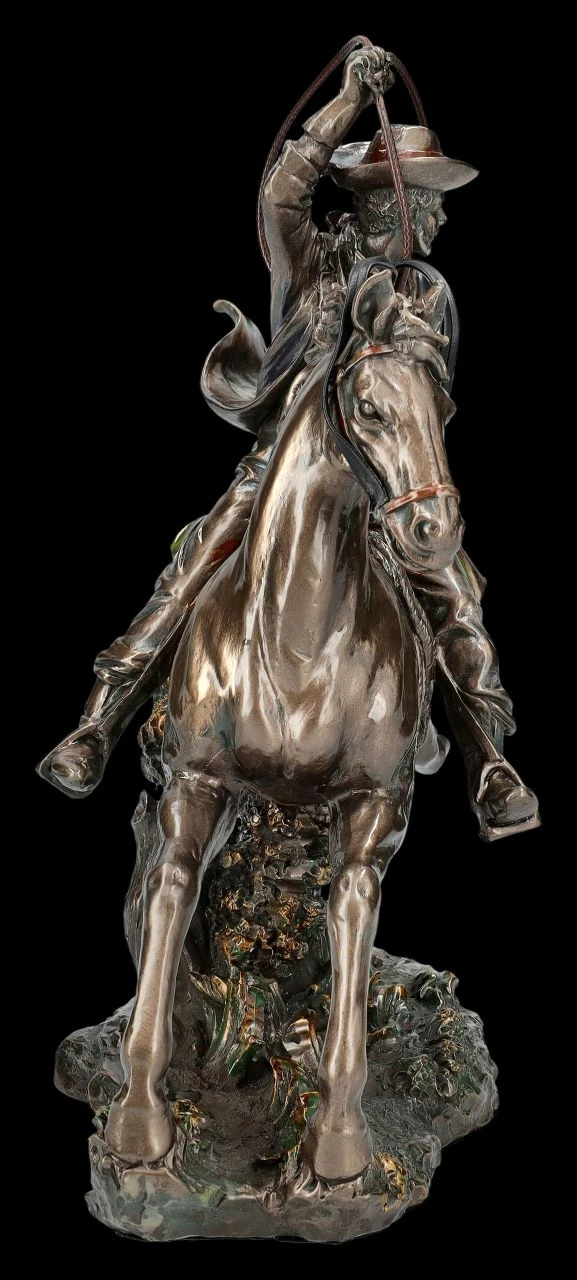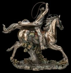 Bei dieser wunderbaren Westernfigur ist eventuell nicht ganz klar, ob es sich um einen altgedienten reitenden Cowboy handelt, ob es der Rancher selbst ist, oder gar ein Kopfgeldjäger kurz vor dem Einfangen eines Delinquenten. Aber eigentlich egal, denn eines ist bei dieser lässig auf seinem Pferd sitzenden Cowboy Figur hervorragend dargestellt – er kann das Lasso perfekt schwingen. Man kann direkt ahnen, dass der Flüchtende oder auch das flüchtende Tier keine Chance hat zu entkommen. Die fantastische reitende Cowboy Figur mit dem Lasso, aber auch das Pferd selbst, sind wunderbar detailreich aus edel bronziertem und zurückhaltend coloriertem Kunststein (Polyresin) gefertigt. Für alle Western-Fans und Western-Reiter ist die 24,5 cm hohe, 25 cm breite und 10,5 cm tiefe Statue eine fantastische Deko. Sie ist daher auch als Trophäe bei einem Western Reitturnier oder auch als Geschenk für Western-Fans perfekt geeignet.