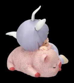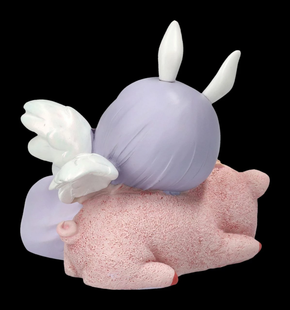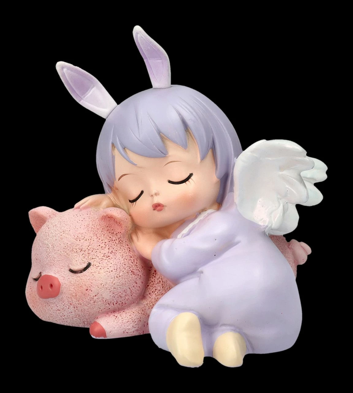 Glück muß man haben, dachte sich das kleine rosa Schweinchen und schlummert ganz beruhigt im Schutz seines Engels ein. Auch wenn wenn das Engelchen mit den lila Haaren, das wie ein kleines Häschen aussieht, nur im Traum sichtbar wird. Das 7 cm hohe, 7,5 cm breite und 6 cm tiefe putzige schlafende Engelchen mit dem Schweinchen wurde aus liebevoll handbemaltem Kunststein (Polyresin) gefertigt. Eine niedliche Frühlingsdekoration und ein süßes Geschenk für alle, die Engel lieben.