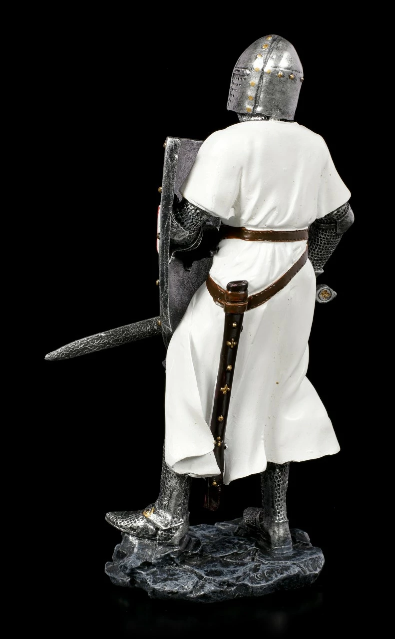 Der handbemalte Kreuzritter aus Kunststein (Polyresin) hat das Schwert leicht erhoben und hält in der linken Hand ein reich verziertes Schild. Die 18,5 cm große Kreuzritter Figur ist ein wunderbares Geschenk für einen Mittelalter Fan und lässt sich wunderbar mit anderen Ritter Figuren kombinieren.