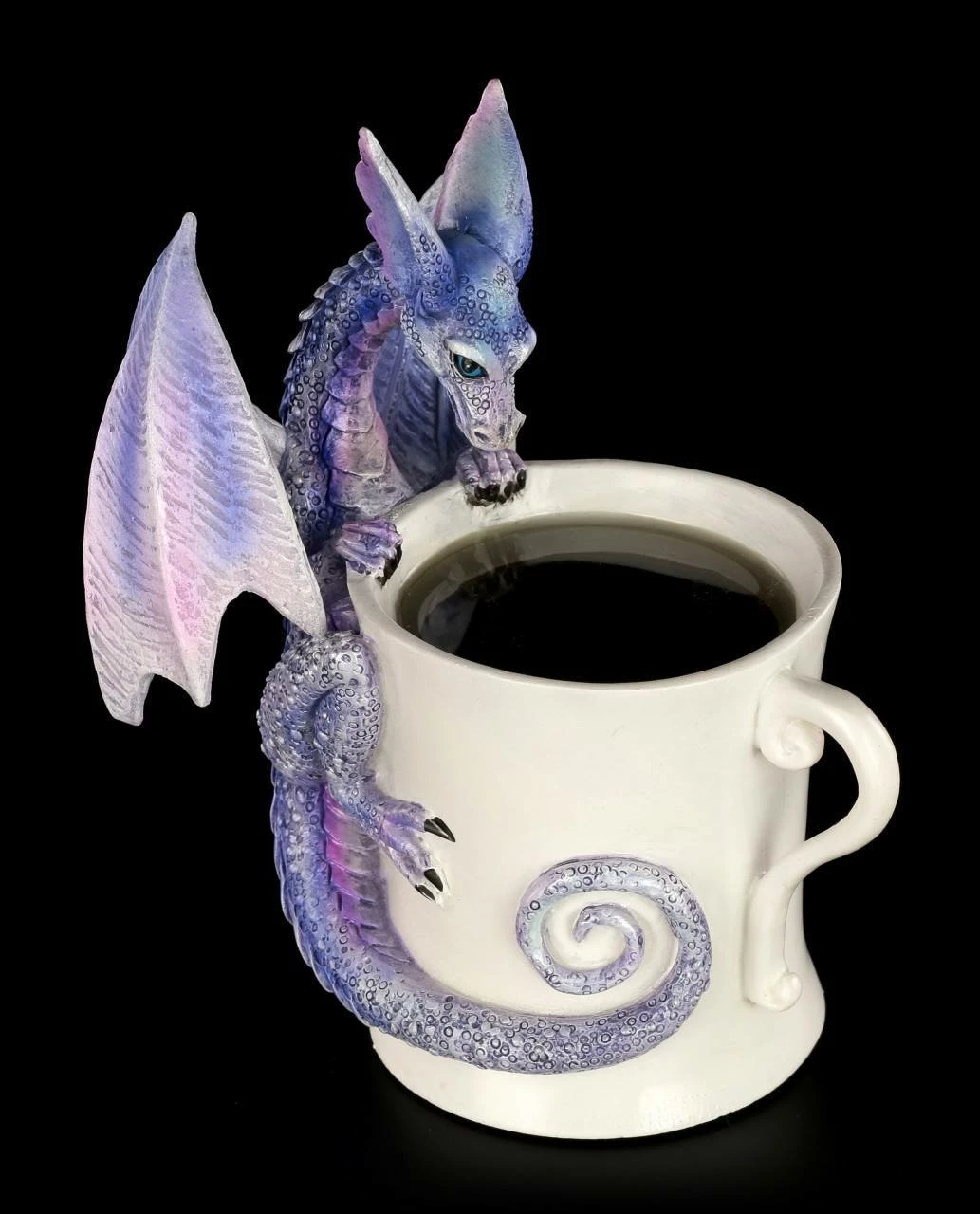 Der kleine Drache ist ganz schön frech! Neugierig schaut der niedliche Drache was in der Tasse ist, er hofft sichtlich auf was leckeres. Aber wer hat schon einen teetrinkenden Drachen gesehen?