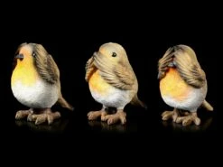 Von Willow Hall sind diese drei putzigen Rotkehlchen, die uns den weisen Rat geben sollen, dass es manchmal besser wäre, nichts Böses zu sehen, zu hören oder zu sagen. Die drei jeweils 8 cm hohen, 6 cm breiten und 7,5 – 8 cm tiefen witzigen kleinen Rotkehlchen im Set sind sehr detailreich aus handbemaltem Kunststein (Polyresin) gefertigt und freuen sich auf einen Platz auf Ihrem Schreibtisch oder der Fensterbank. Die entzückenden Rotkehlchen sind aber auch ein tolles und vielsagendes Geschenk.