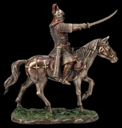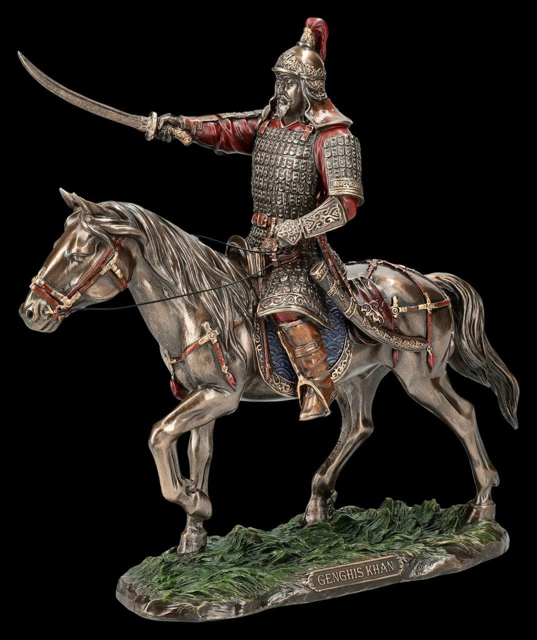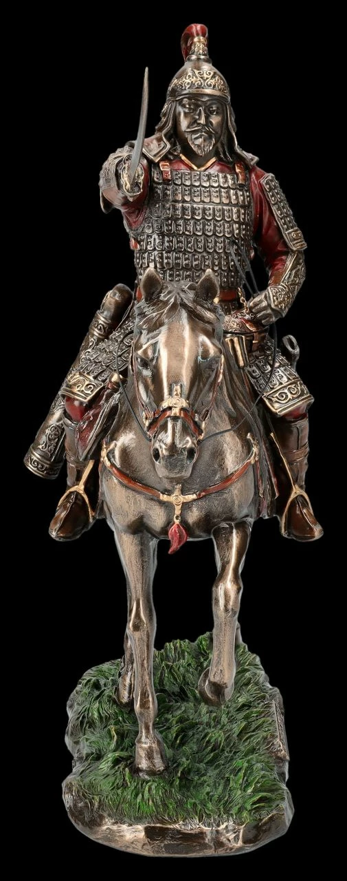 Die prachtvolle Figur des Dschingis Kahn auf dem Pferd und mit Säbel in der Hand stammt aus der Studio Collection von Veronese und ist fantastisch detailreich aus hochwertigem Kunststein (Polyresin) gefertigt. Die 24 cm hohe, 23,5 cm breite und 9,5 cm tiefe bronzierte Figur ist sehr zurückhaltend coloriert und wirkt dadurch sehr beeindruckend und edel. Der Gründer des Mongolischen Reiches Dschingis Khan vereinte einst die mongolischen Stämme, die als Nomaden lebten und untereinander grenzenlos verfeindet waren. Er eroberte und plünderte mit seiner wilden Horde weite Teile Nordchinas und Zentralasiens und drang mit seinen Truppen sogar bis Persien vor. Dschingis Khan regierte sein Riesenreich von 1206 bis 1227, eine Zeit, in der er nicht nur Furcht und Schrecken verbreitete, sondern in der es ihm gelang, bis heute zur Legende zu werden. Als er 1227 starb, wurden angeblich alle lebendigen Wesen seiner Umgebung – einschließlich der 2000 Begräbnisgäste getötet und mit ihm beigesetzt. Die geheime Grabstätte wurde allerdings bis heute nicht gefunden. Für alle Bewunderer von Dschingis Khan ist diese fantastische Figur auch ein beeindruckendes Geschenk.
