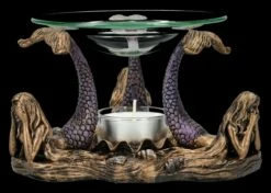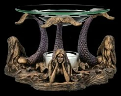 Nicht nur die drei weisen Affen demonstrieren das berühmte japanische Zitat, dass es besser ist, nichts Böses zu sehen, zu hören und schon gar nicht zu sagen. Es hat sich sogar bis zu den magischen Wesen auf dem Meeresgrund herumgesprochen. Und so zeigen die drei zauberhaften Meerjungfrauen, dass auch sie sich an diese Weisheit halten. Dabei balancieren sie auf den Flossen ihrer erhobenen Fischschwänze eine Glasschale mit 12 cm Durchmesser, die als Duftlampe dienen kann. Das Teelicht, das zwischen den drei Grazien auf dem Meeresboden abgestellt werden kann, kann nicht nur das Duftöl erhitzen, sondern beleuchtet auch magisch diese faszinierende Szene. Der Teelichthalter aus handbemaltem Kunststein (Polyresin) ist 9 cm hoch, 15 cm breit und 15 cm tief. Er ist nicht nur dekorativ, sondern auch ein zauberhaftes Geschenk. Die Lieferung erfolgt ohne Teelicht.