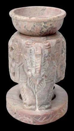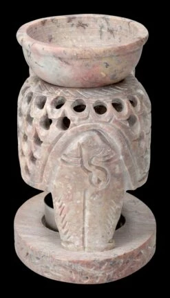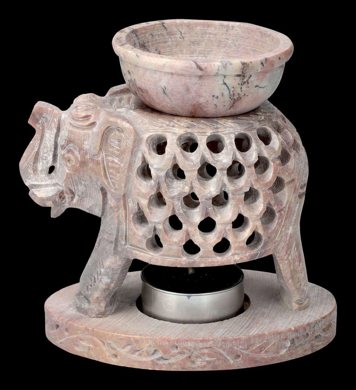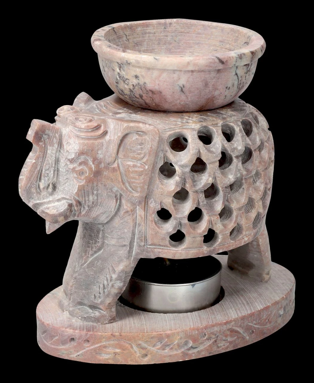 Trägt der Elefant den Rüssel nach oben wird es so gedeutet, dass er das Glück anzieht. So sollte diese fantastische Duftlampe im asiatischen Stil in Richtung eines Fensters blicken, damit das Glück hereingebeten wird. Die 11,5 cm hohe, 11 cm breite und 7,5 cm tiefe Duftlampe mit dem Elefanten wurde sorgfältig aus Speckstein gefertigt. Die Schale für die Düfte hat einen Durchmesser von 6 cm und eine Höhe von 2 cm. Da es sich um einen Naturstein handelt, kann die Farbe abweichend zur Abbildung ausfallen. Auch als Glücksbringer ist diese interessante Duftlampe aus Speckstein ein wunderbares Geschenk. Die Lieferung erfolgt ohne Teelicht.