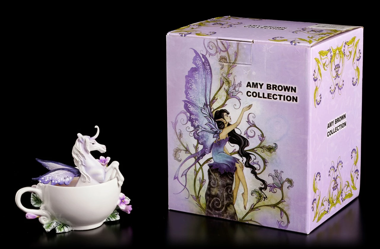 Das niedliche freche Einhorn gönnt sich ein Bad in einer Teetassse. Das Einhorn ist ein liebevolles Geschenk an einen Einhorn Liebhaber.