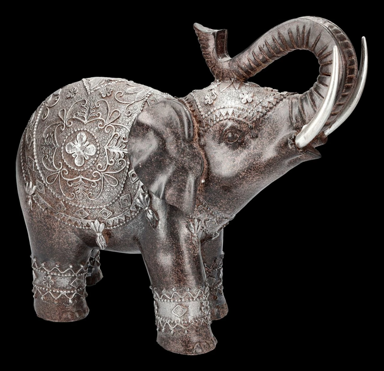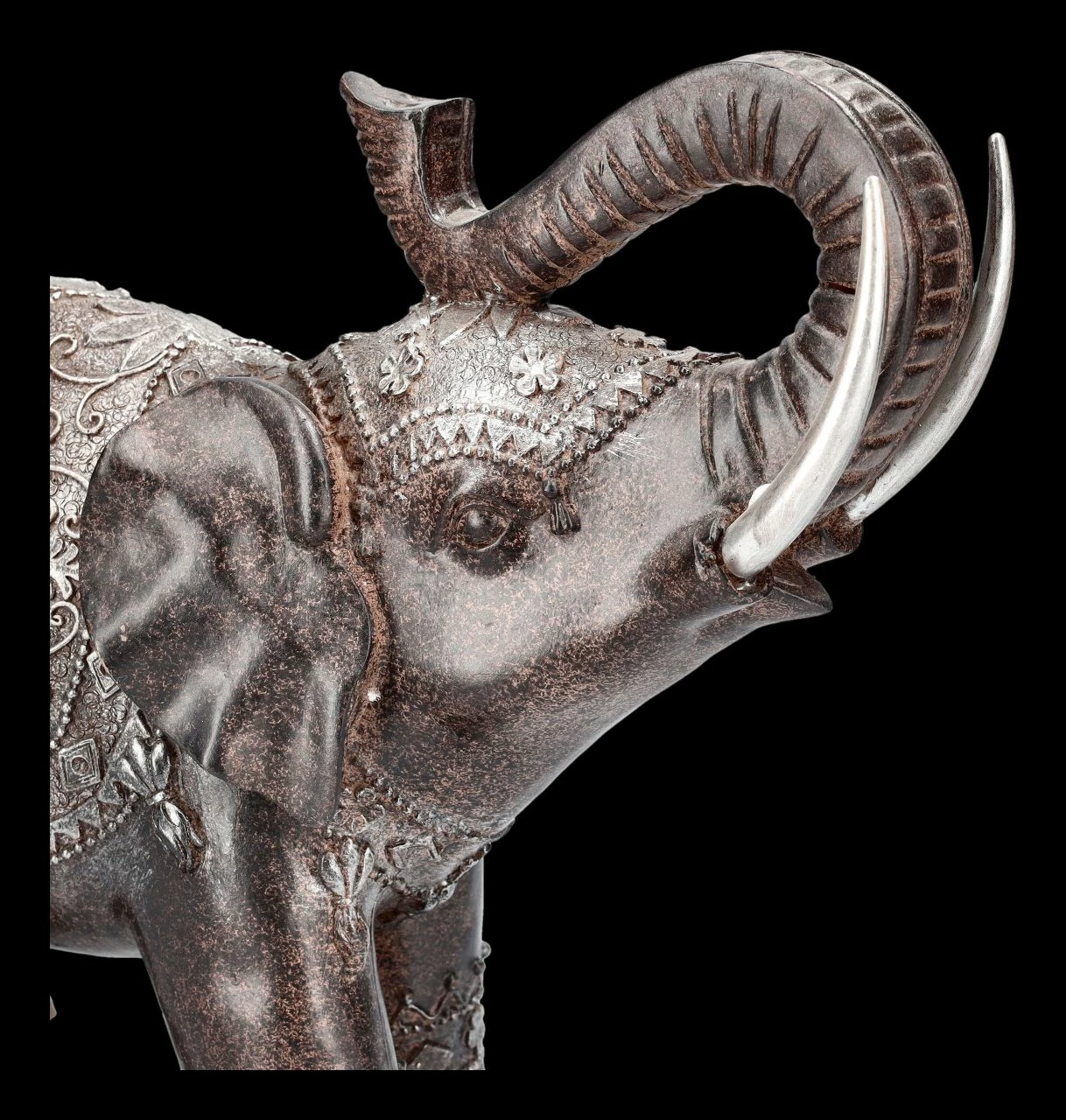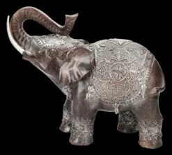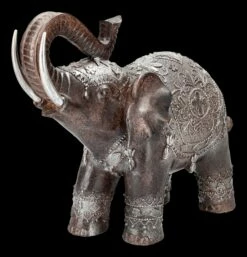 Sie möchten Ihrer Wohnung ein asiatisches Feeling geben oder sie nach den Regeln des Feng Shui einrichten? Dann ist dieser indische Elefanten als Glückssymbol für Reichtum und Wohlstand für die neue Dekoration besonders gut geeignet. Im Feng Shui werden Elefanten gerne eingesetzt, da sie den Schlaf positiv beeinflussen sollen. Außerdem ist dieser braune indische Elefant aus Kunststein (Polyresin) mit der zart gemusterten Decke durch die feine Handbemalung auch sehr dekorativ. Mit der Höhe von 26 cm, der Breite von 12 cm und der Tiefe von 27 cm wird der Elefant mit dem hoch erhobenen Rüssel zum Mittelpunkt auf dem Sideboard oder der Fensterbank. Als Glücksbringer ist er aber auch ein perfektes Geschenk zur Hochzeit, denn schließlich gelten Elefanten mittlerweile nicht nur in Asien und Afrika als Glückssymbol, da sie für Treue, Klugheit, Stärke und Güte stehen.