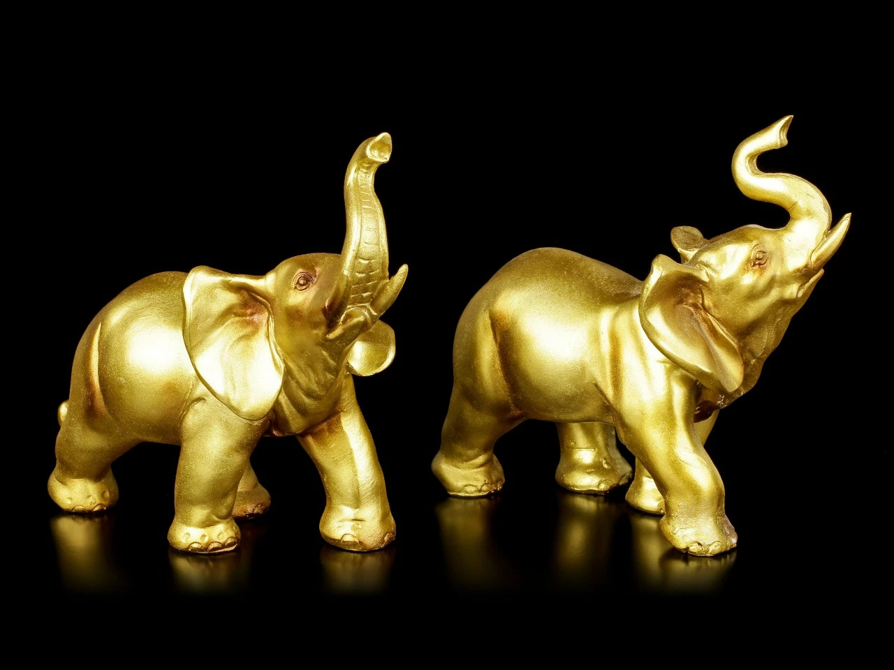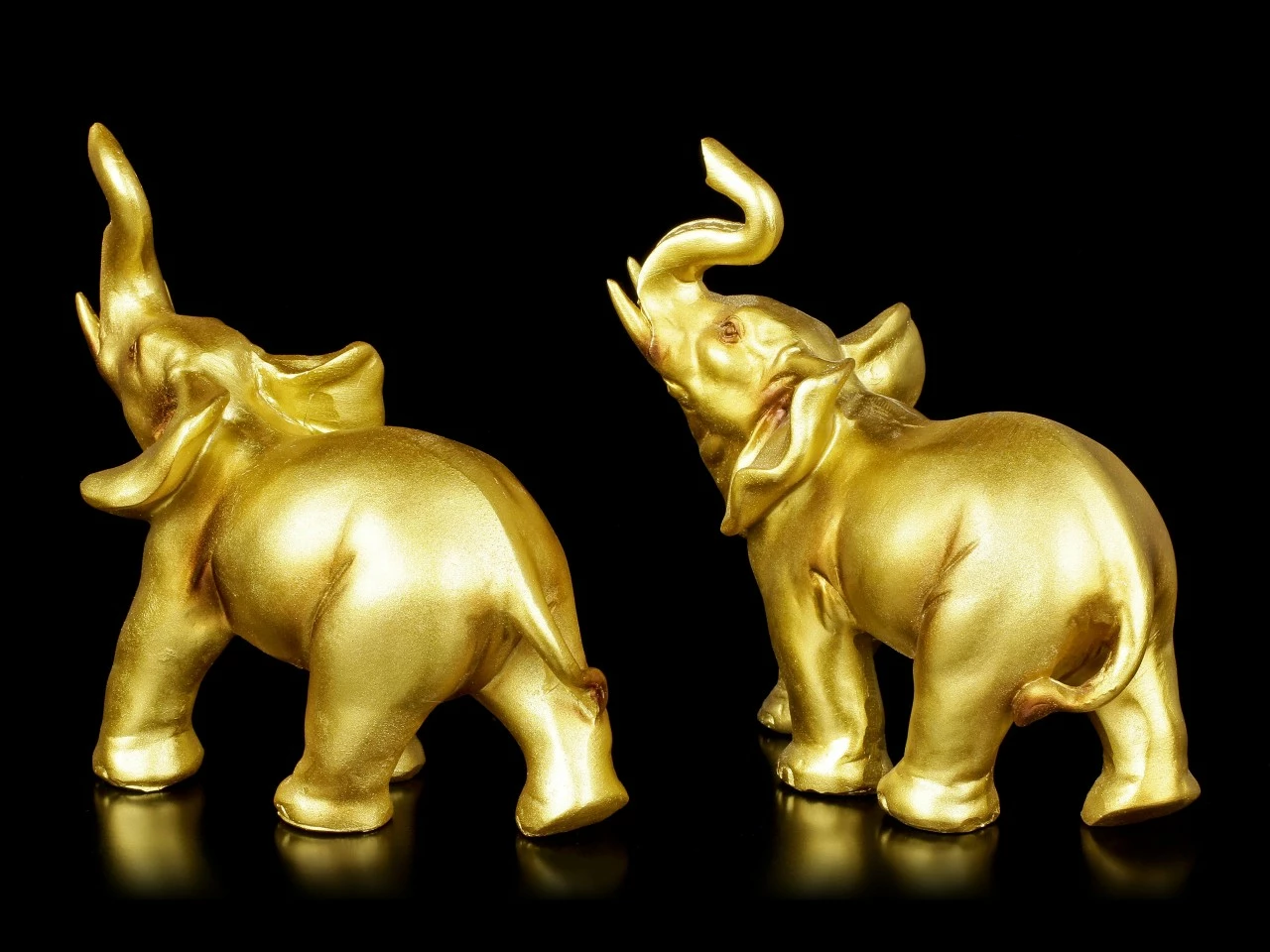 Die zwei wunderschönen handbemalten Elefanten aus Kunststein (Polyresin) wirken wie aus purem Gold gegossen. Beide haben ihre Rüssel hoch erhoben und scheinen laut zu trompeten. Sind sie nicht niedlich? Die zwei Elefanten sind wunderbare glänzende Glücksbringer.