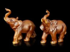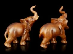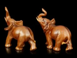 Die beiden wunderschönen handbemalten Elefanten aus Kunststein (Polyresin) wirken wie aus braunen Holz geschnitzt. Beide haben ihre Rüssel hoch erhoben und scheinen laut zu trompeten. Sind sie nicht niedlich? Die zwei Elefanten sind wunderbare Glücksbringer.