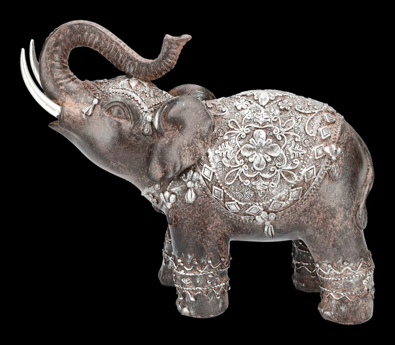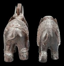 Die beiden indischen Elefanten sind das perfekte Geschenk zur Hochzeit, denn schließlich gelten Elefanten als Symbol für Treue, Klugheit, Stärke und Güte. Elefanten sind mittlerweile nicht nur in Asien und Afrika als Glücksbringer beliebt. Als Glückssymbol für Reichtum und Wohlstand sind sie damit auch als Geschenk zum Einzug ins neue Heim besonders gut geeignet. Auch im Feng Shui werden sie gerne eingesetzt, da sie den Schlaf positiv beeinflussen sollen. Außerdem sind die beiden braunen indischen Elefanten aus Kunststein (Polyresin) mit den gemusterten Decken durch die zarte Handbemalung auch sehr hübsch anzusehen. Mit der Höhe von 15,5 – 19 cm, der Breite von je 8,5 cm und der Tiefe von je 20 cm sind sie ein sehr dekoratives Element auf dem Sideboard oder der Fensterbank.