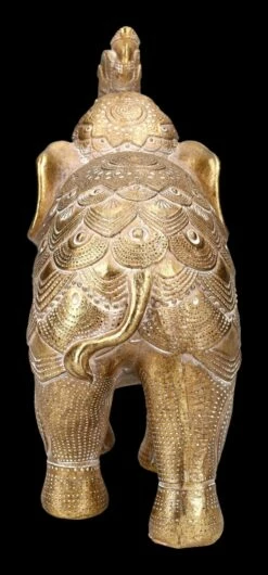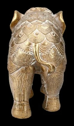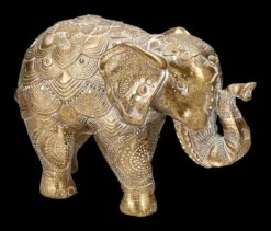 Als Glückssymbol für Reichtum und Wohlstand sind die beiden goldfarbenen indischen Elefanten besonders gut als Geschenk zum Einzug ins neue Heim geeignet, denn sie werden beim Einrichten im Feng Shui gerne eingesetzt, da sie den Schlaf positiv beeinflussen sollen. Außerdem wirken die beiden goldfarbenen handbemalten indischen Elefanten aus Kunststein (Polyresin) mit den Musterungen durch die Handbemalung auch sehr edel. Mit der Höhe von 15,5 – 19 cm, der Breite von je 8,5 cm und der Tiefe von je 20 cm sind sie ein sehr dekoratives Element auf dem Sideboard oder der Fensterbank. Das 2er-Set mit den Elefanten-Figuren ist auch ein perfektes Geschenk zur Hochzeit, denn schließlich gelten Elefanten als Symbol für Treue, Klugheit, Stärke und Güte.