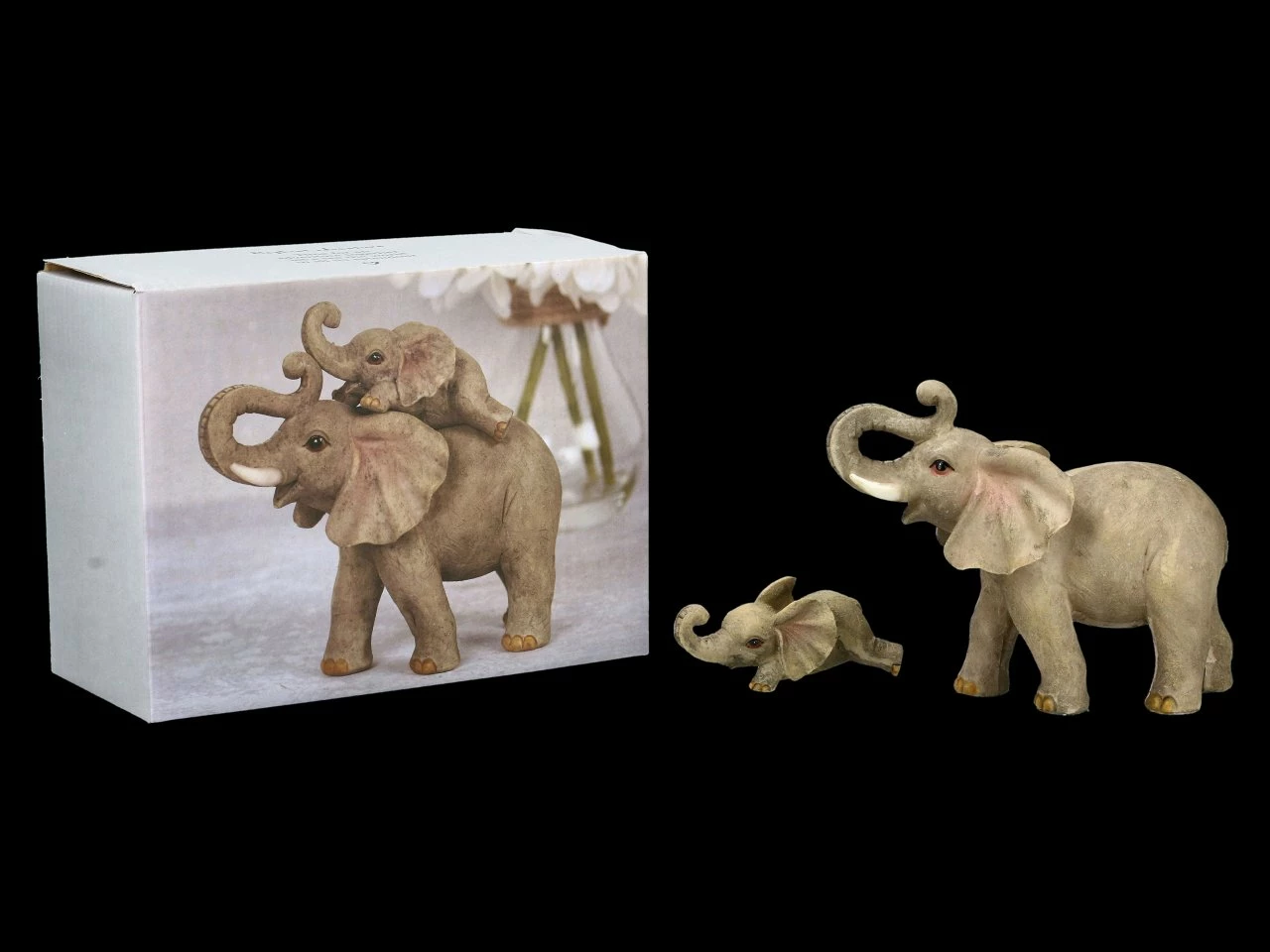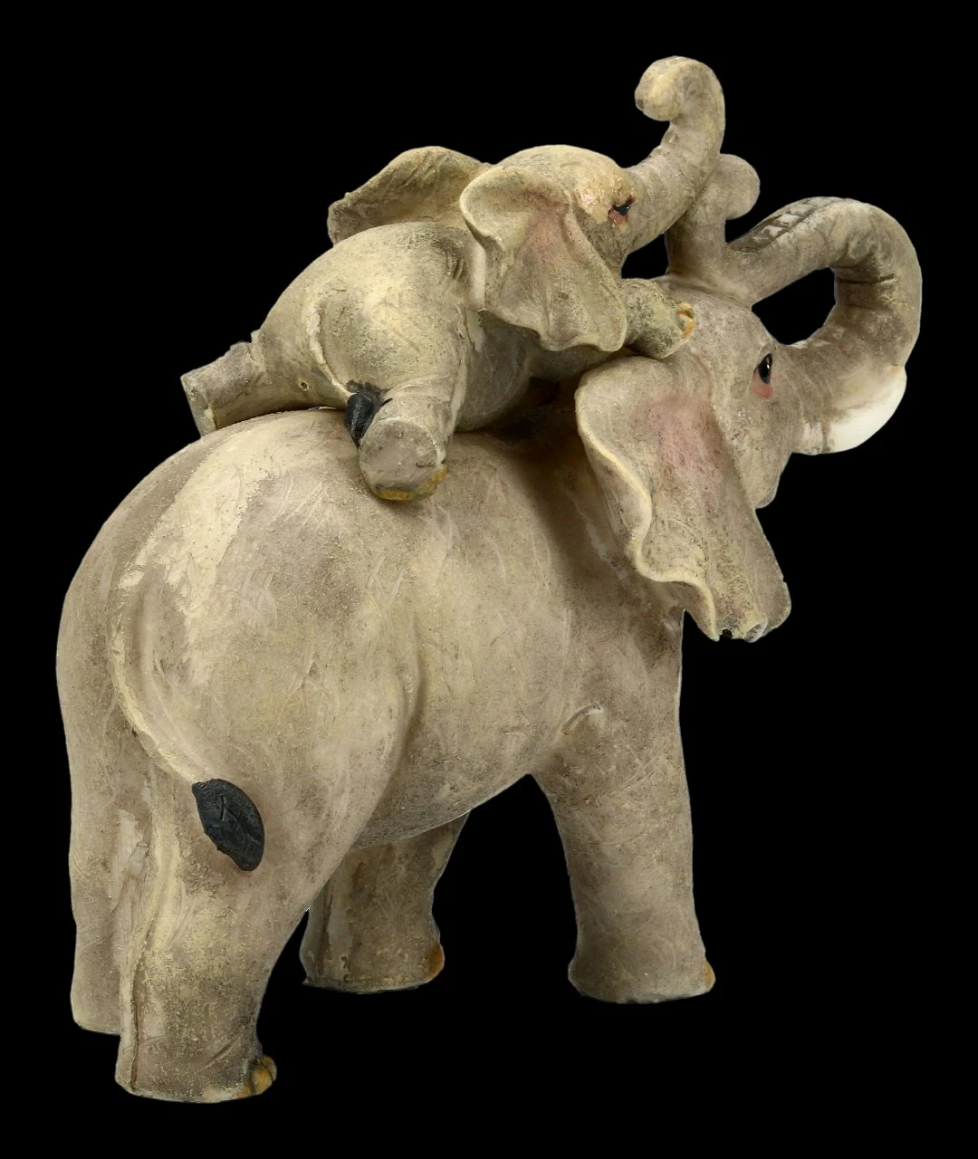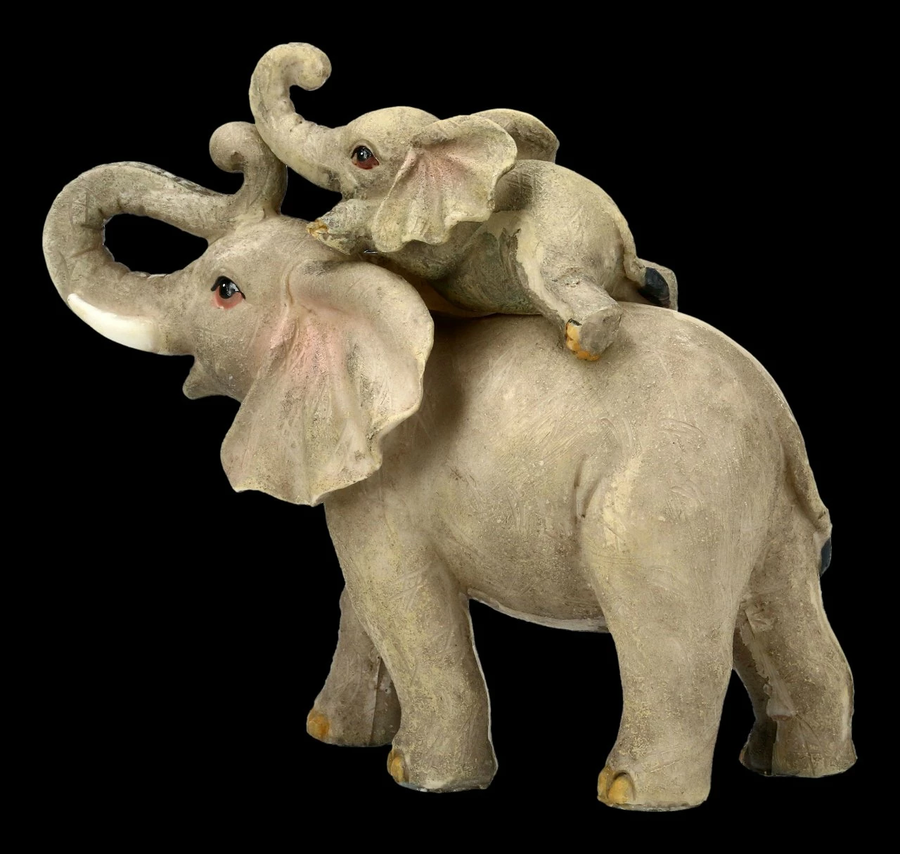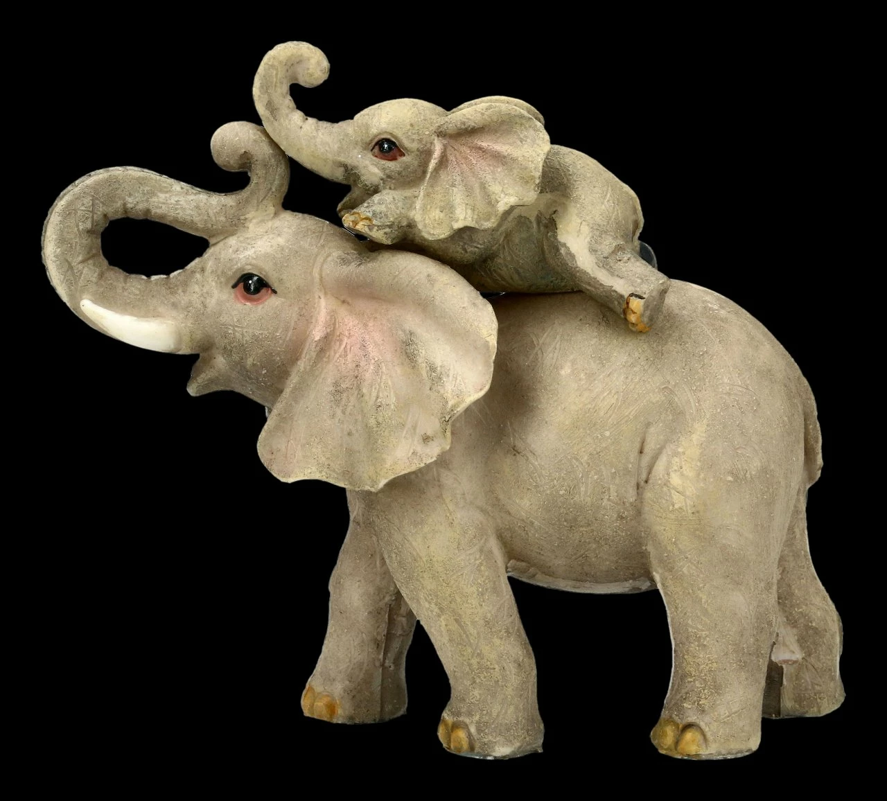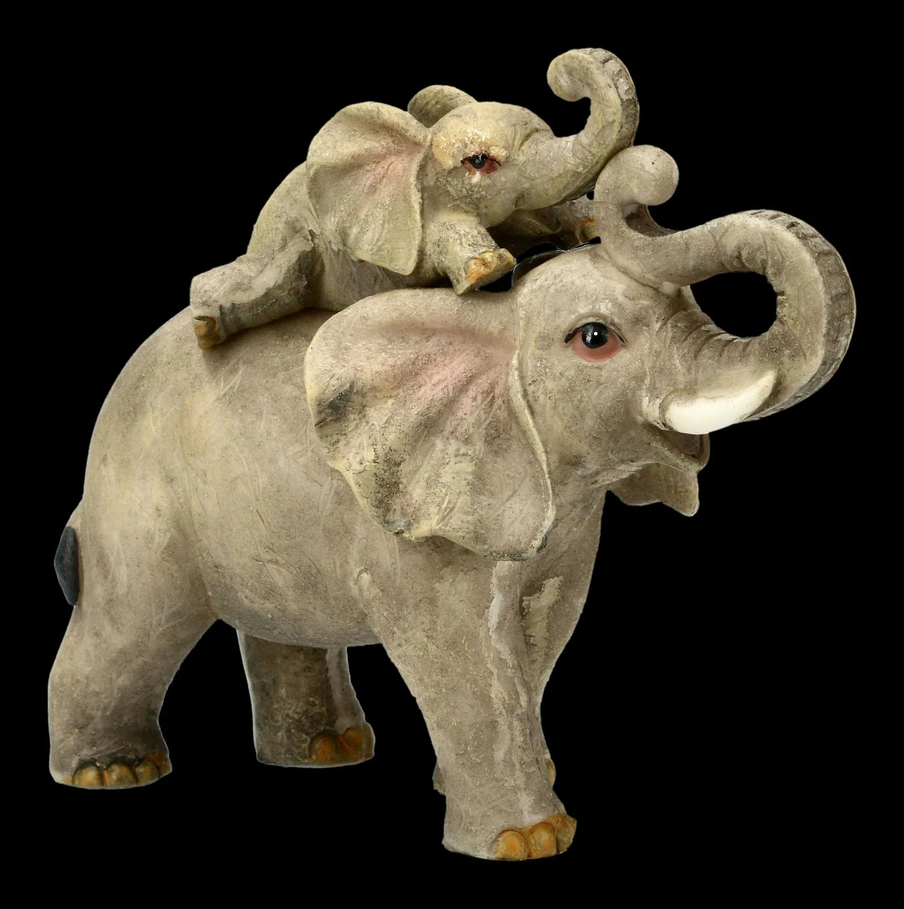 Elefanten sind Glücksbringer und diese Elefanten-Mutter mit ihrem Baby zeigen das Glück sehr deutlich. Für den kleinen Baby Elefanten ist es ein herrliches Abenteuer, auf der Mutter herum zu klettern. Die beiden Elefanten sind 12 cm hoch, 14,5 cm breit und 6,5 cm tief und können gestapelt werden. Sie sind detailreich aus handbemaltem Kunststein (Polyresin) gefertigt und eine tolle Deko-Idee, aber auch ein besonders liebevolles Geschenk. Die Geschenkverpackung ist inklusive.