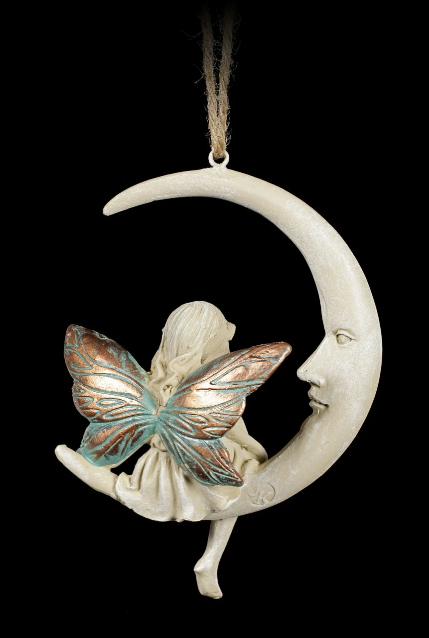 Die kleine Elfe Rosa hat es sich bei ihrem Fraund dem Mann im Mond bequem gemacht. Ganz entspannt sitzt sie auf der Mondsichel und betrachtet mit ihm die Sterne. Die süße Elfen Figur zum Hängen aus liebevoll handbemaltem Kunststein (Polyresin) ist eine wundervolle Deko in einem Kinderzimmer. Lassen Sie die Träume Ihres Kindes von dieser süßen Elfe beschützen.