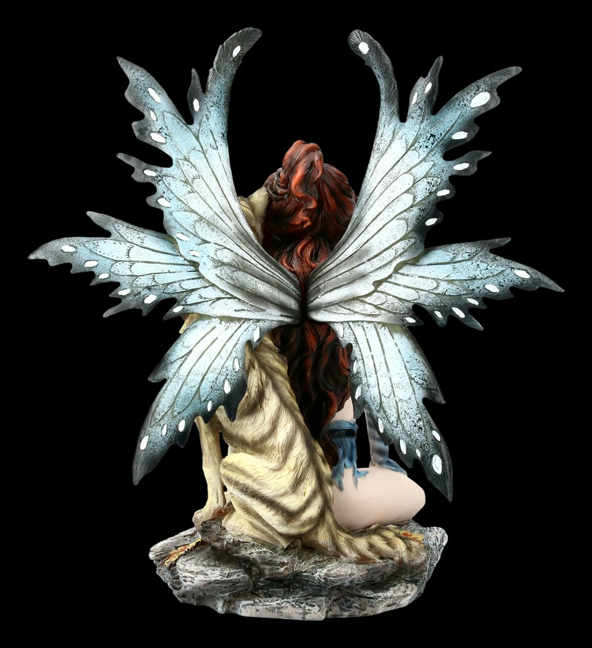 Der Wolf hat sich gemütlich hinter der Elfe Celeste gesetzt und freut sich sichtlich über die Streicheleinheiten. Die feine und genaue Machart und die gelungene detaillierte Farbgebung gibt der Elfenfigur eine gewisse Lebendigkeit, die überzeugt. Diese Elfe schenkt dem Raum eine besondere Atmosphäre.