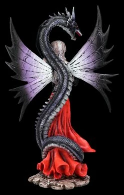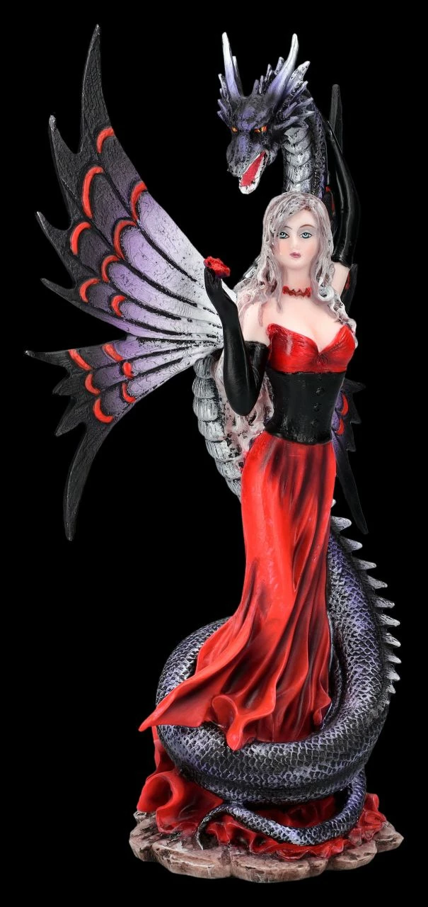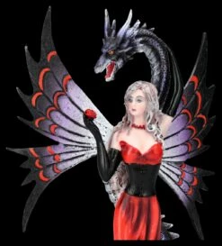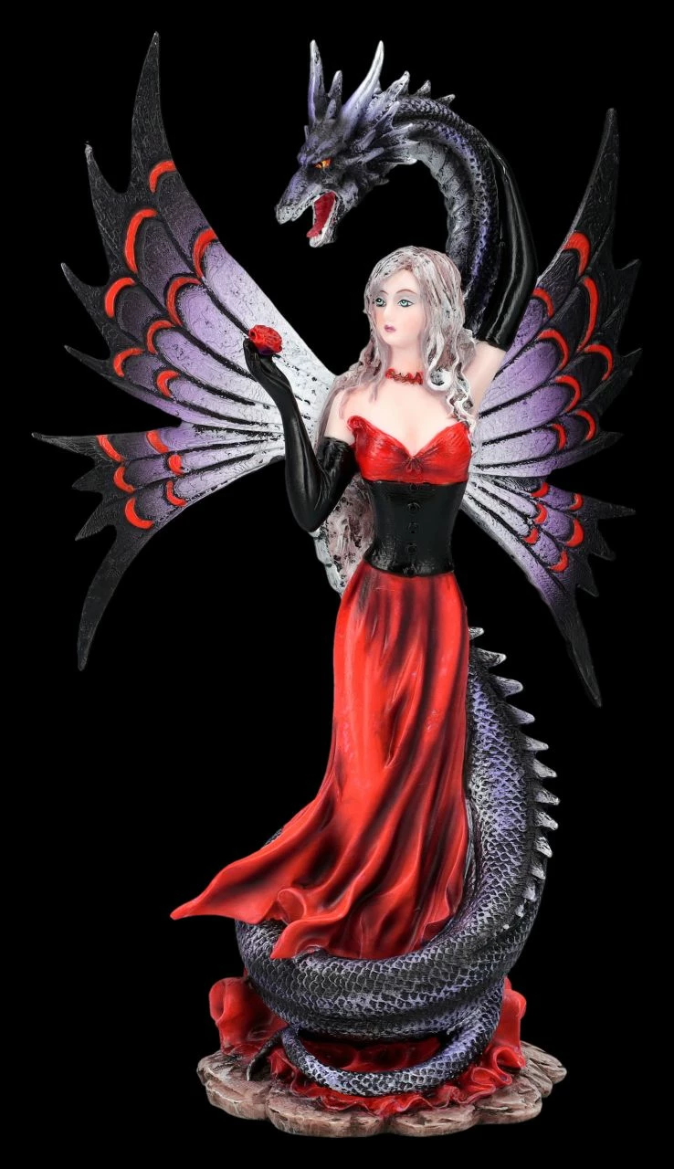 Wie überall gibt es natürlich auch im Reich der Elfen die geheimnisvollen starken Wesen, die mit ihrer erotischen Ausstrahlung durchaus gefährlich werden können. Wie die wunderschöne Elfe Fiera, die in ihrem langen blutroten Kleid mit schwarzem Mieder und den schwarzen langen Handschuhen stolz vor ihrer riesigen Drachenschlange steht, die sich am Boden um sie windet und hinter ihrem Rücken hoch aufragt. Mit einer Hand streichelt sie zärtlich den Hals der Drachenschlange und in der anderen präsentiert sie ihr als Symbol ihrer Zuneigung eine blutrote Rose. Die Elfe Fiera mit der Drachenschlange ist nicht nur eine prachtvolle Deko, sie ist auch ein wunderbares Geschenk für alle Elfen-Freunde. Die faszinierende Elfe-Figur aus sorgsam handbemaltem Kunststein (Polyresin) ist 23 cm hoch, 14 cm breit und 8 cm tief. Die zum Kleid passenden rot gemusterten großen dunklen Flügel sind zum Stecken.
