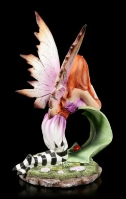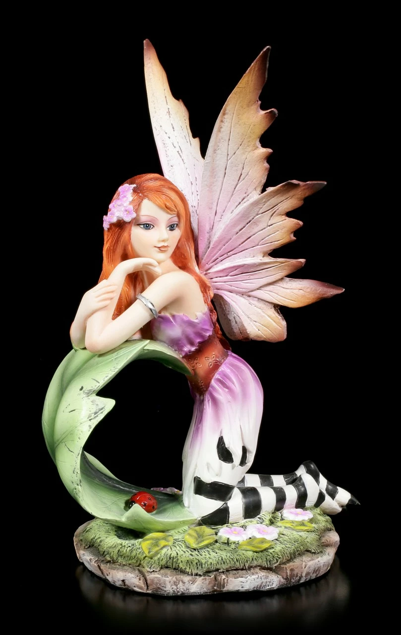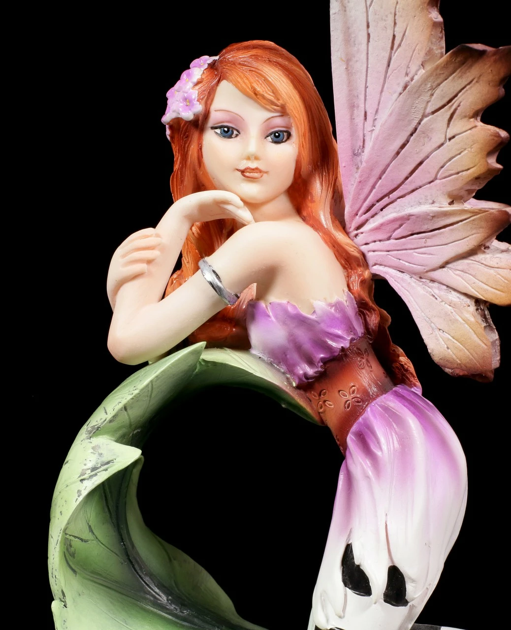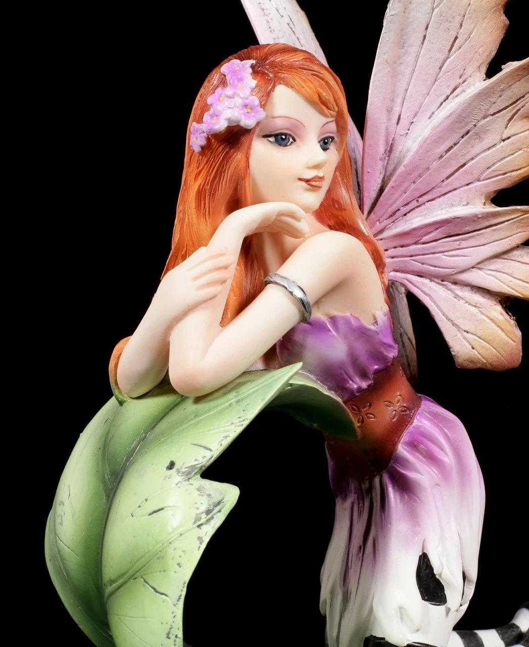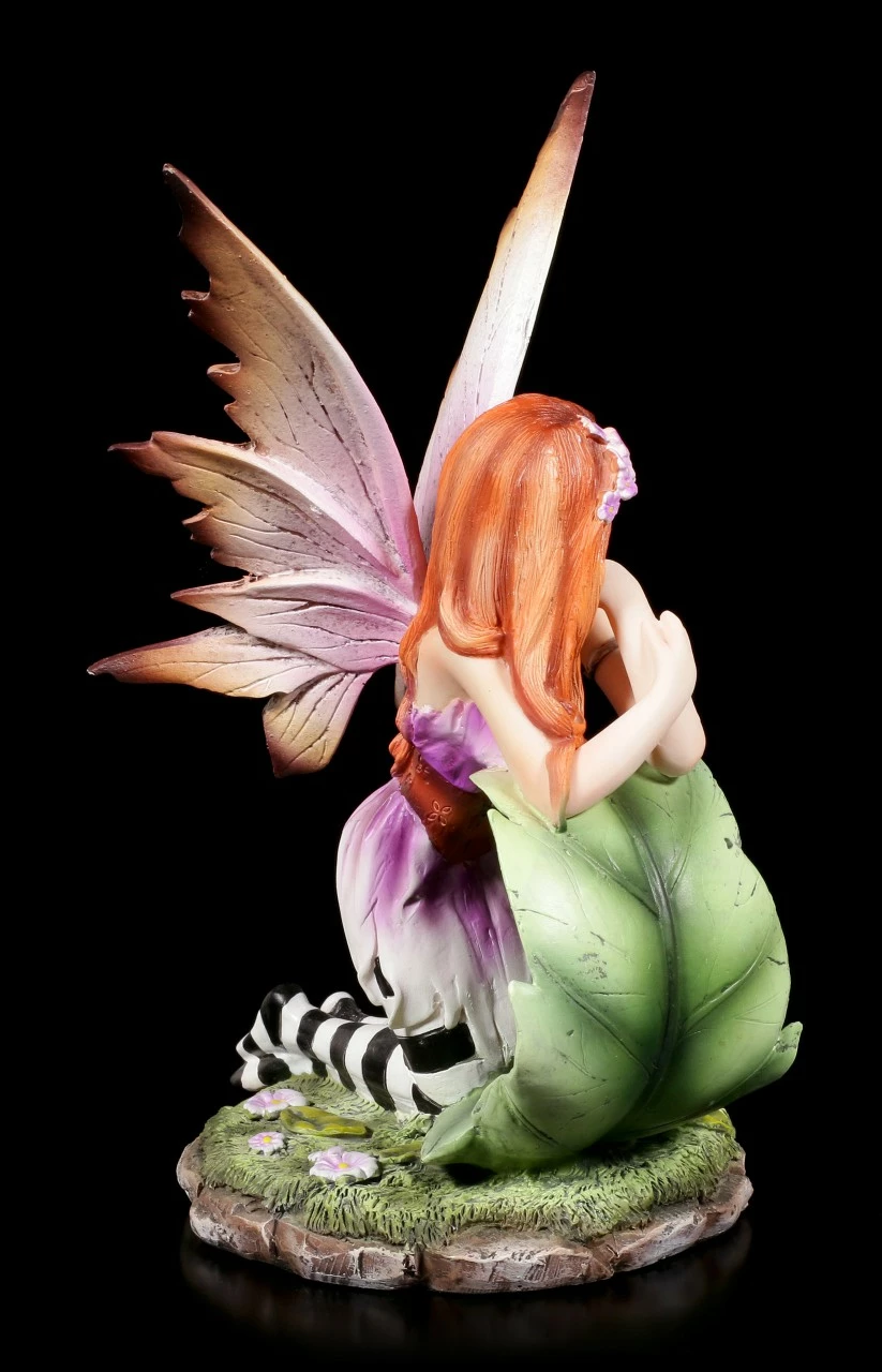 Süße kleine handbemalte Elfe aus Kunststein. Foglia lehnt sich verträumt an ein Blatt und scheint ihre Umgebung ganz genau zu betrachten. Ihr hübsches lila Kleid steht im perfekten Kontrast zu ihren Ringelstrümpfen.