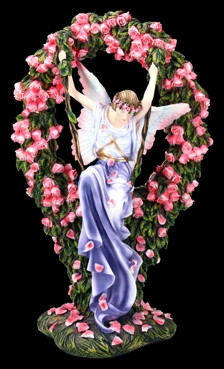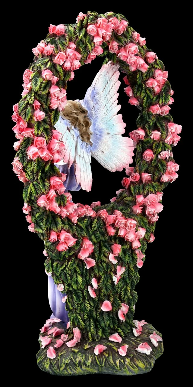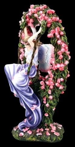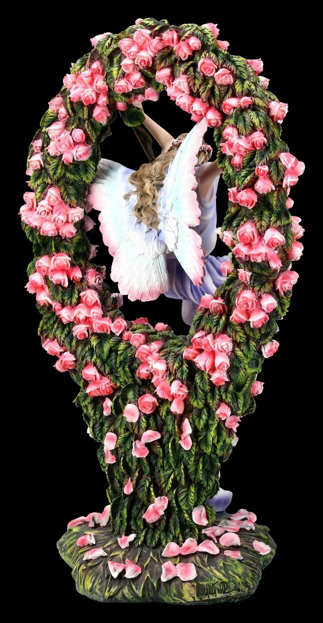 Die wunderschöne Elfe schaukelt in einem Rosenbogen, der unzählige Blüten trägt. Die Elfe ist die Wächterin des Eingangs in das Feenreich. Sie lässt nur die Menschen eintreten, die fest und ehrlich an die magische Welt glauben. Die wunderschöne Elfenfigur stammt von der Künstlerin Sheila Wolk. Sie wurde hochwertig angefertigt und liebevoll handbemalt. Die vielen kleinen Details bringen jeden Betrachter zum Staunen, so dass die Statue wunderbar in eine Sammlung passt.