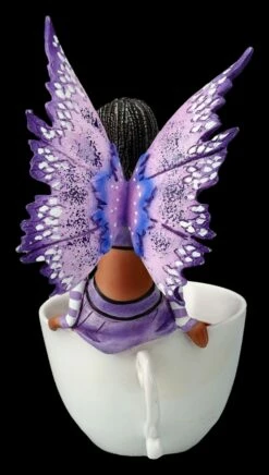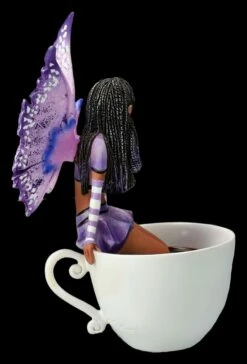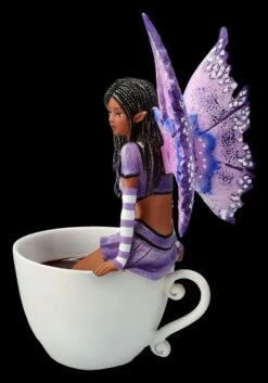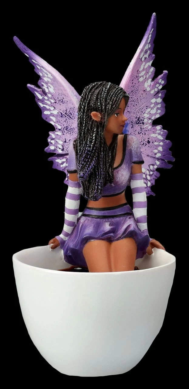 Der beliebten amerikanischen Fantasy- und Gothic-Künstlerin Amy Brown gelingt es immer wieder, ihre Elfen und Feen auch als mutige, freche und lebendige Wesen darzustellen. Wie auch bei dieser zauberhaften Elfe mit den schwarzen Rastalocken, die am Tassenrand sitzt und ihre Füße im Tee in der Tasse badet. Die Tasse mit der ‚Tea Fairy‘ von Amy Brown ist bis zu den einzelnen Details aus liebevoll handbemaltem Kunststein (Polyresin) entstanden. Die zur Kleidung passenden violetten Flügel der 14 cm hohen, 9,5 cm breiten und 7,5 cm tiefen Elfe sind zum Stecken. Wie wäre es also mit einer Teepause mit der frechen kleinen Elfe? Sie ist natürlich auch ein wunderbares Geschenk.