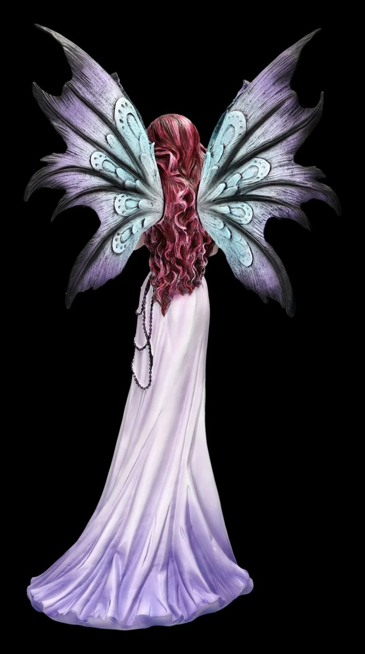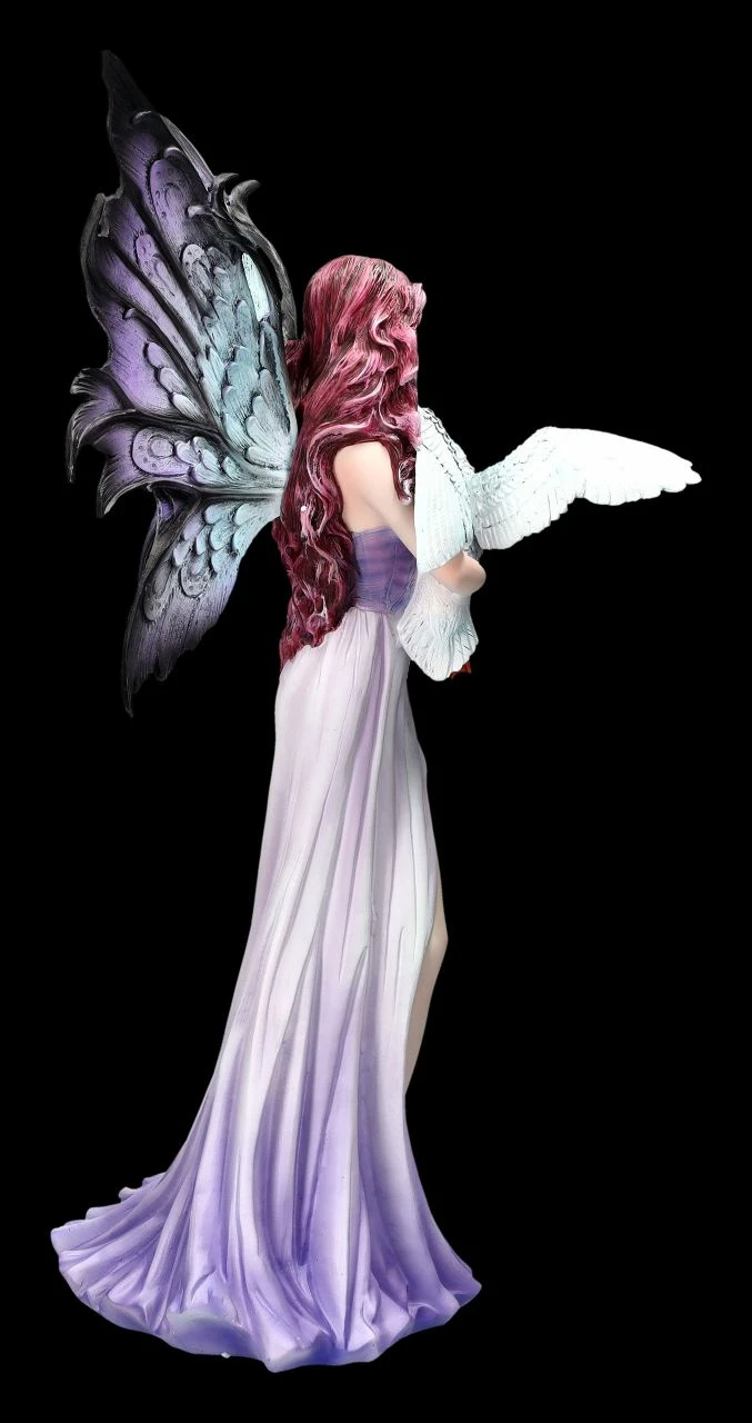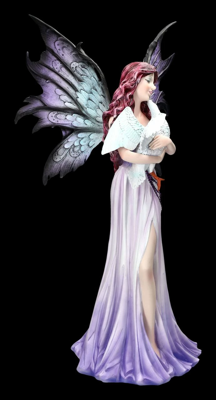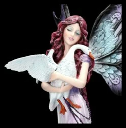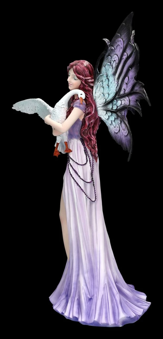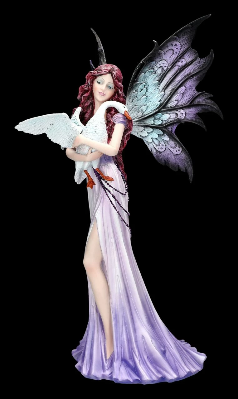 ZĂ€rtlich schmiegt der Schwan seinen Kopf an den Hals der wunderschönen Elfe Kassandra. In der griechischen Mythologie gab einst Gott Apollon ihrer Namensschwester, betört von ihrer Schönheit, die Gabe der Weissagung. Auch die Elfe Kassandra ist nicht nur schön, sondern hat ebenfalls diese Gabe. So konnte sie den verzweifelten Kampf des schönsten der weiĂen SchwĂ€ne gegen Unholde im See entdecken und ihn retten. Nachdem sie die Unholde vertrieben und den Schwan von seinen Verletzungen geheilt hatte, will sie ihn wieder zu seinen GewĂ€ssern bringen. Allerdings sieht es so aus, dass er lieber in ihren Armen bleiben möchte. Kein Wunder, denn die Elfe Kassandra mit den roten langen Haaren sieht in ihrem seidig fallenden Kleid und mit den schönen FlĂŒgel in den Farben eines Nachtfalters einfach herrlich aus. Die beeindruckende Elfe Kassandra mit dem Schwan ist 47 cm hoch, 23 cm breit und 18 cm tief. Sie wurde aus liebevoll handbemaltem Kunststein (Polyresin) gefertigt und ist auch ein wunderbares Geschenk fĂŒr jeden, der von der mystischen Welt der Elfen begeistert ist.
