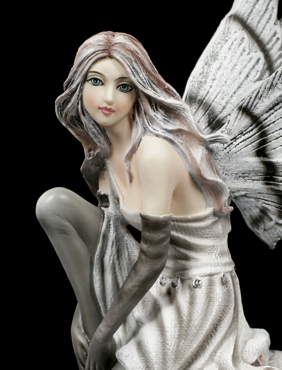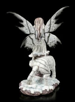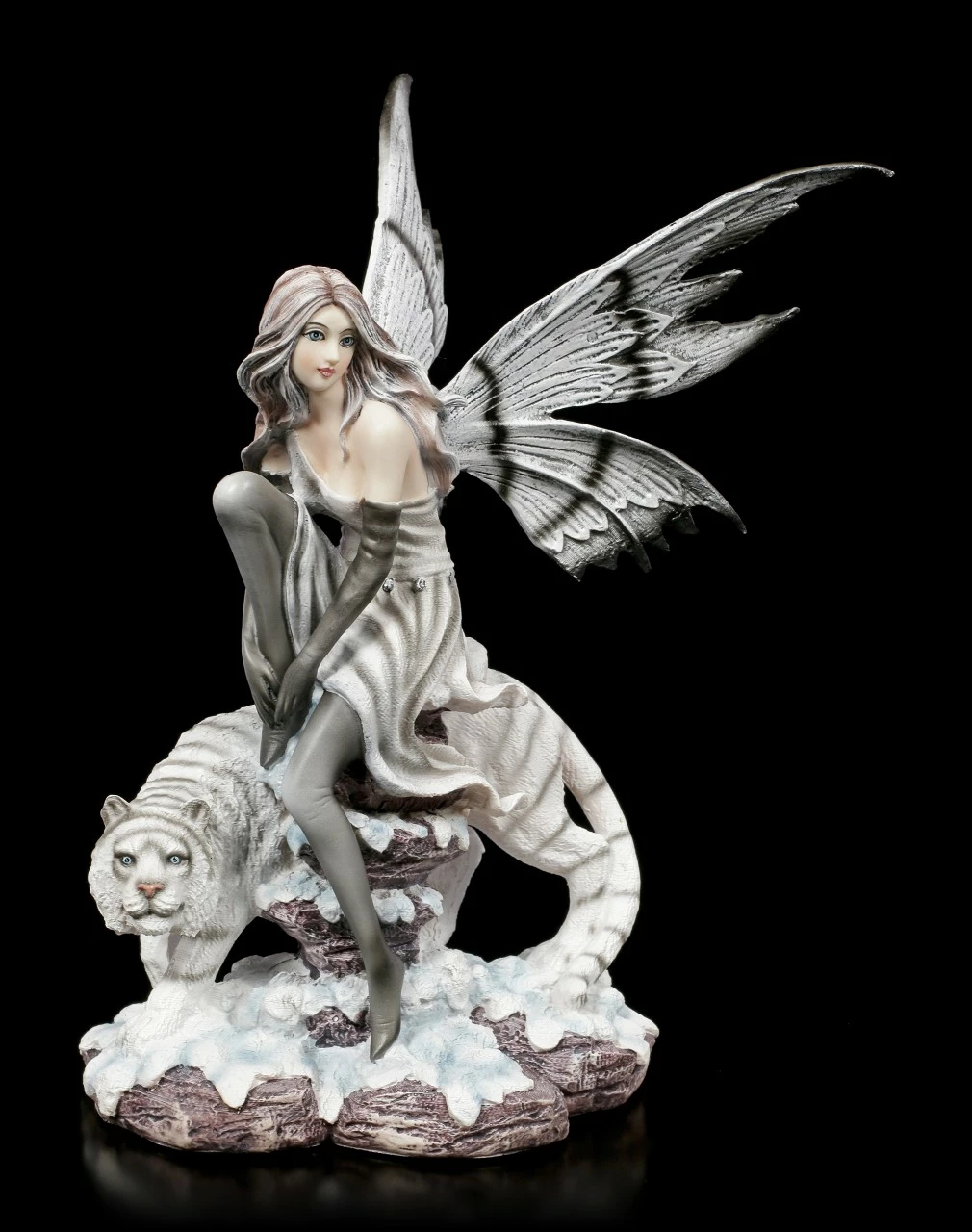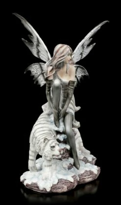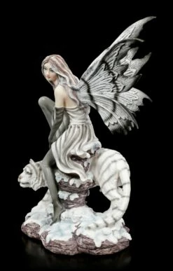 Die Elfe Kassandra geht mit ihrem Tiger spazieren. Sie ruht sich gerade gemütlich auf einer Steinsäule aus. Der Tiger passt dabei gut auf die anmutige Elfe auf. Ihr grau-schwarzes Kleid und ihre schwarz gestreiften weißen Flügel harmonieren perfekt mit der Fellfarbe des weißen Tigers. Die liebevoll handbemalte Elfenfigur aus Kunststein (Polyresin) würde wunderbar in eine Sammlung passen.
