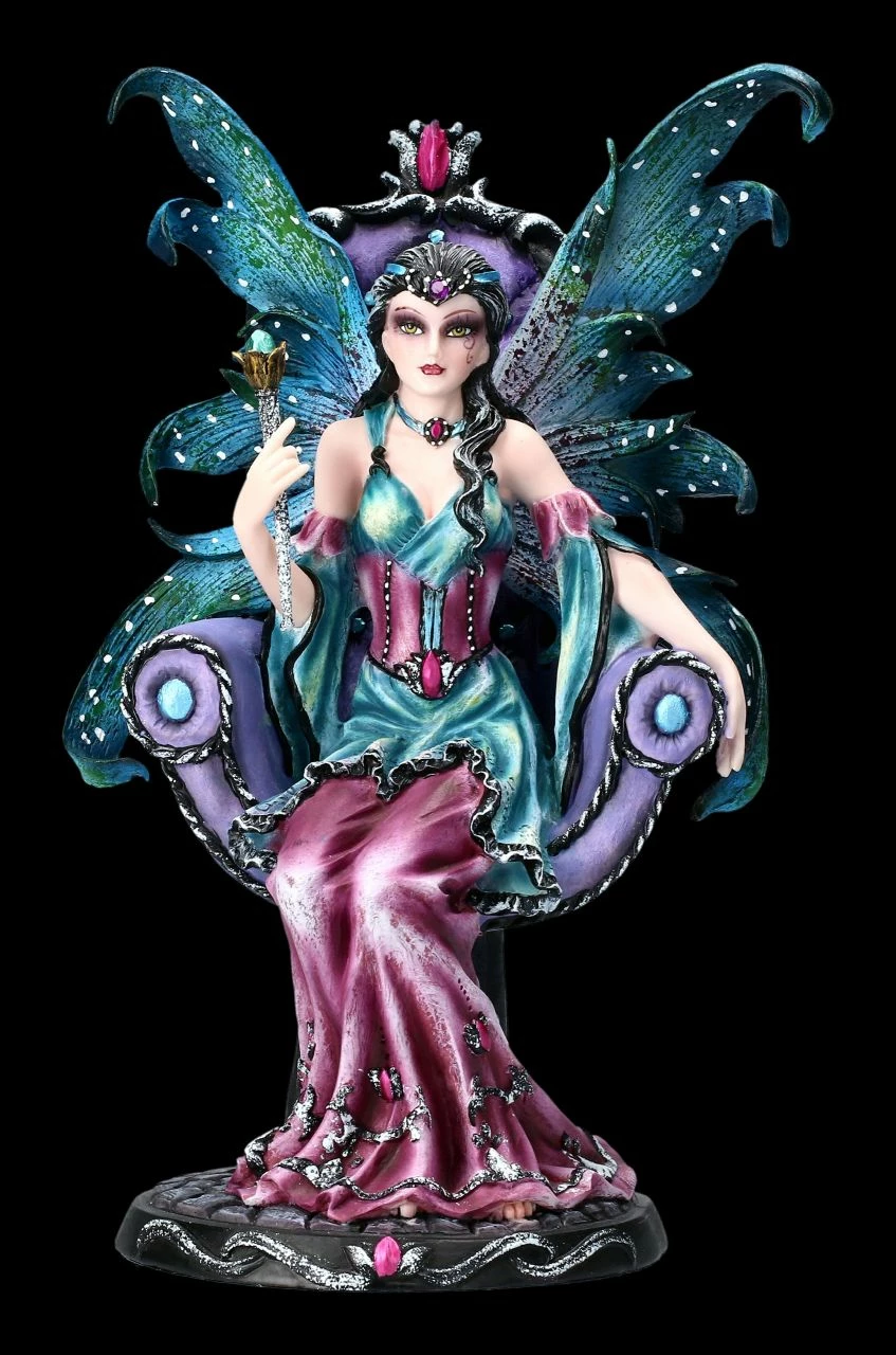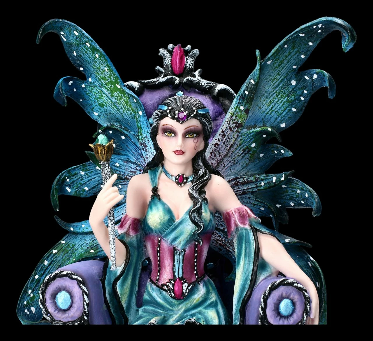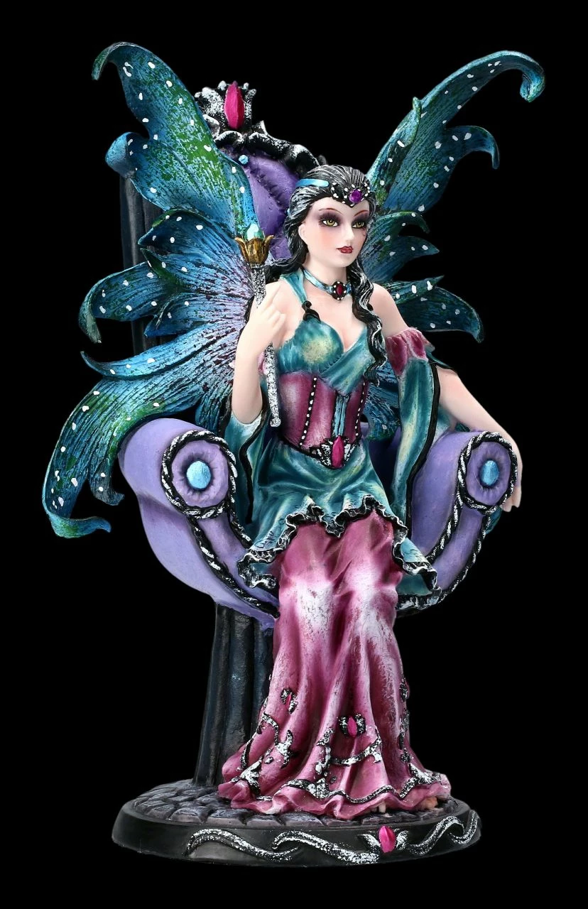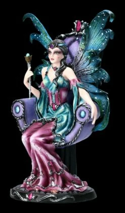 Reich geschmückt und mit dem Zepter in der Hand sitzt die wunderschöne Königin des Frühlings auf ihrem imposanten lilafarbenen Thron. Ihr langes dunkelrosa Kleid mit dem Mieder und der silberfarbenen Bordüre reicht bis zum Boden, während die schönen filigranen Flügel die blaue Farbe des Unterkleides wiedergeben Mit ihrer Höhe von 26 cm, der Breite von 18 cm und der Tiefe von 13 cm ist die wunderbare Elfen Figur sehr detailreich aus Kunststein (Polyresin) gefertigt und liebevoll handbemalt. Die Königin des Frühlings ist eine sehr attraktive Dekoration und ein fantastisches Geschenk für alle Elfenfreunde und -Sammler.