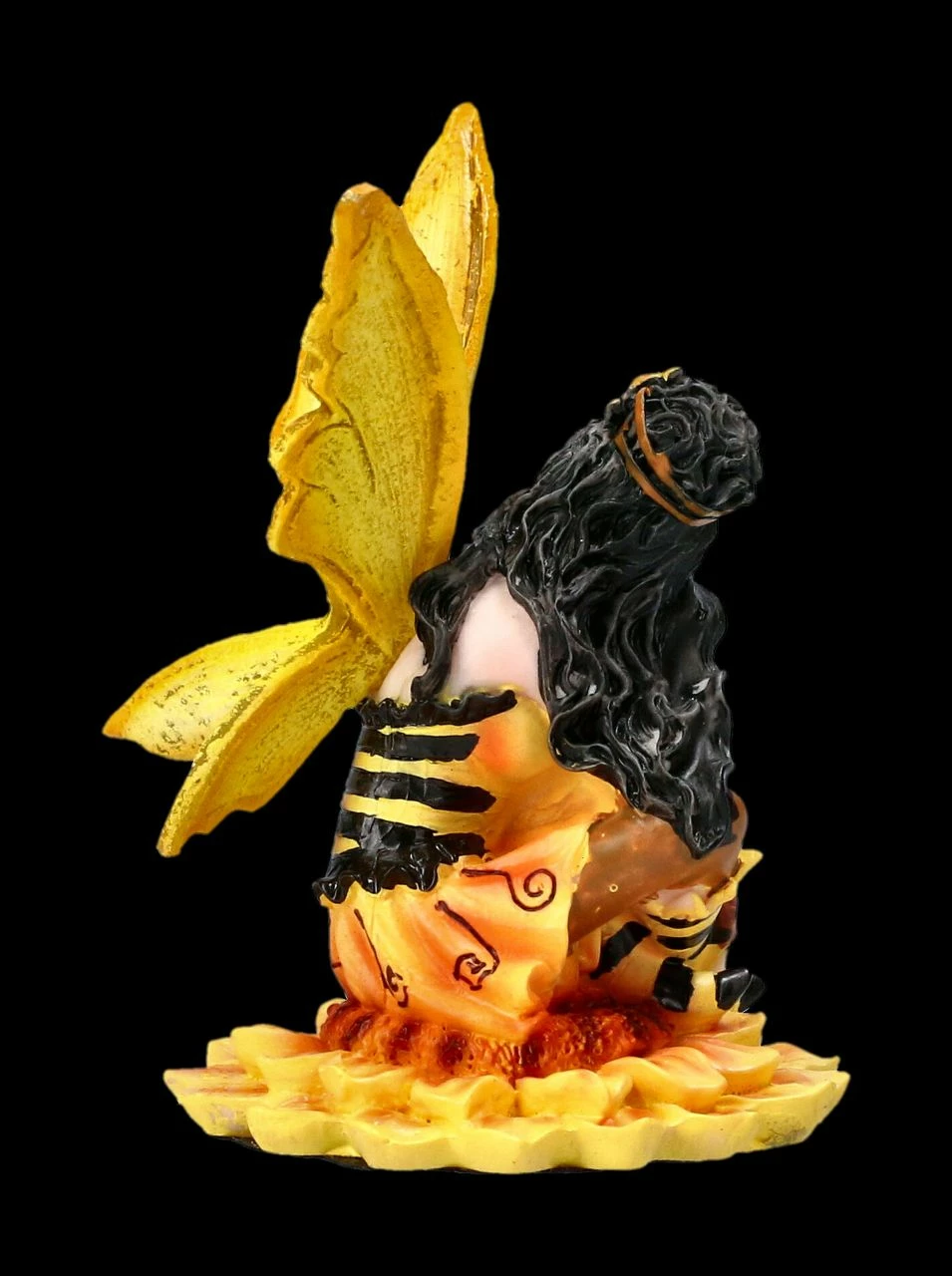 Ihr niedliches Köpfchen mit den langen schwarzen Haaren auf Hand und Knie gestützt, sitzt die süße kleine Mini Fee mitten in einer Sonnenblume. Ihr gelb und schwarz gestreiftes Kleidchen und die Ringelstrümpfe legen nahe, dass sie wie die Bienen vom Nektar naschen möchte. Mit ihrer Höhe von 8 cm, der Breite von 6 cm und der Tiefe von 6 cm ist die sehr detailreich aus Kunststein (Polyresin) gefertigte und liebevoll handbemalte süße kleine Elfen Figur ein wunderbares Geschenk nicht nur für Elfenfreunde und -Sammler, sie ist auch eine romantische Dekoration für jede Blumenbank.