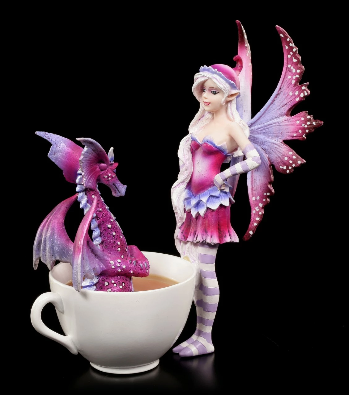 Da will einer ja gar nicht mehr aus der Tasse! Die Elfe verucht den Drachen zu überreden, aus der Tasse zu steigen. Aber der kleine Kerl weigert sich standhaft. Diese wunderbare Figurenkombination von Amy Brown ist eine Freude anzusehen.