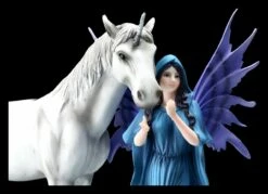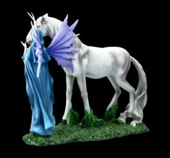 Auf ihrem Weg durch den Zauberwald trifft Mythica auf ihr Einhorn. Liebevoll streichelt Mythica das Einhorn und freut sich über das Wiedersehen. Aus sehr detailliert und liebevoll handbemaltem Kunststein (Polyresin) gefertigt, freut sich jeder Einhorn und Elfenfreund über diese schöne Elfen-Figur in den zarten, mysthischen Farben. Die Flügel der Elfe sind zum Stecken. Mythica und ihr Einhorn haben eine Höhe von 29,5 cm, eine Breite von 34,0 cm und eine Tiefe von 16,0 cm. Die Elfenfigur Mythica findet mit ihrem Einhorn sicher einen schönen Platz in Ihrer Wohnung. Sie ist aber auch ein tolles Geschenk für Sammler.