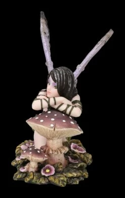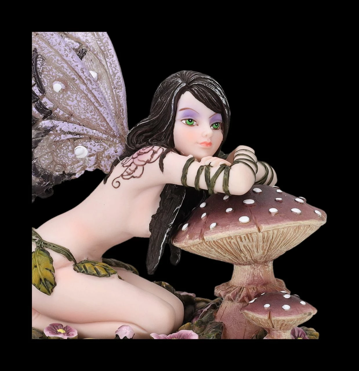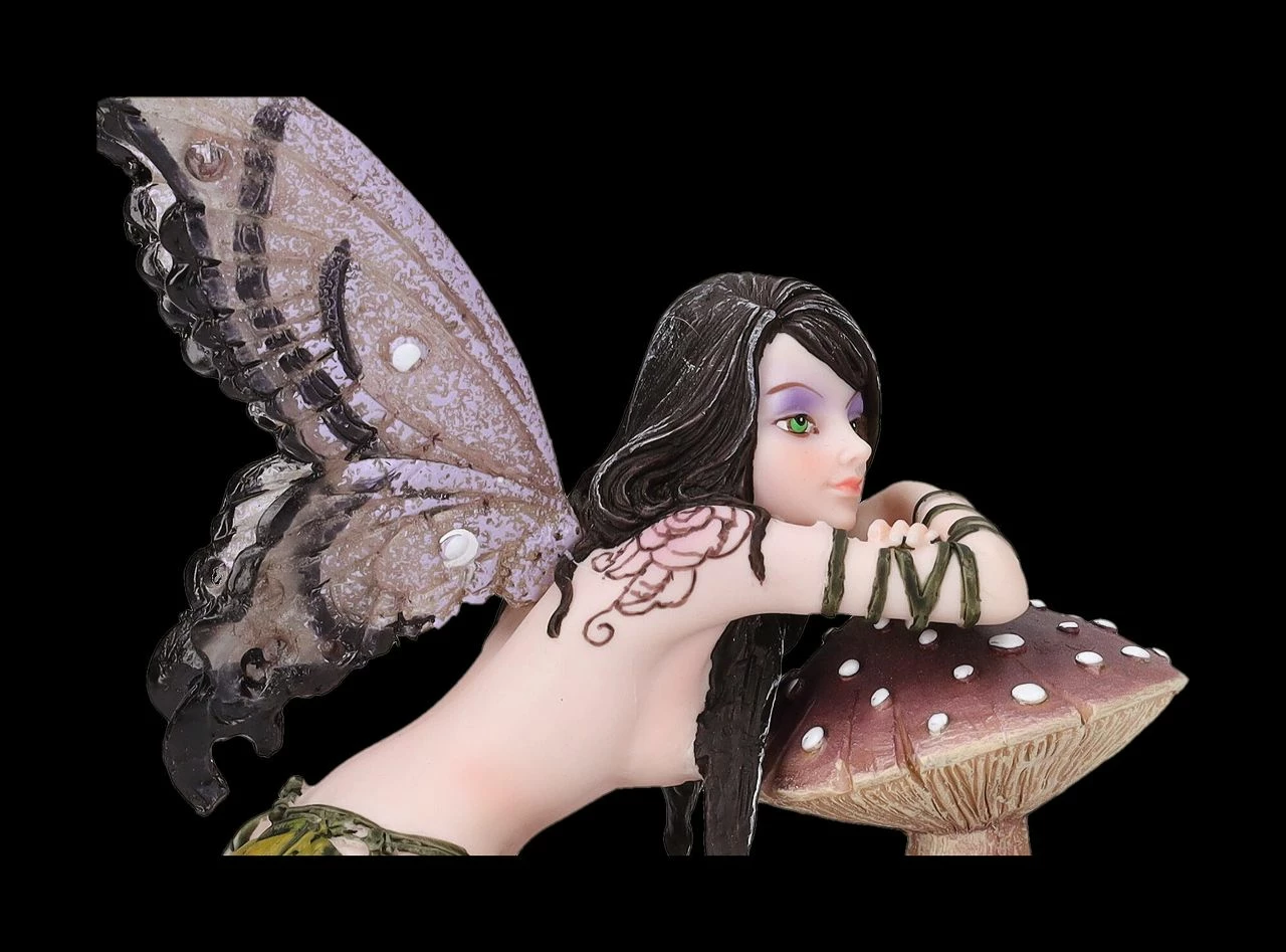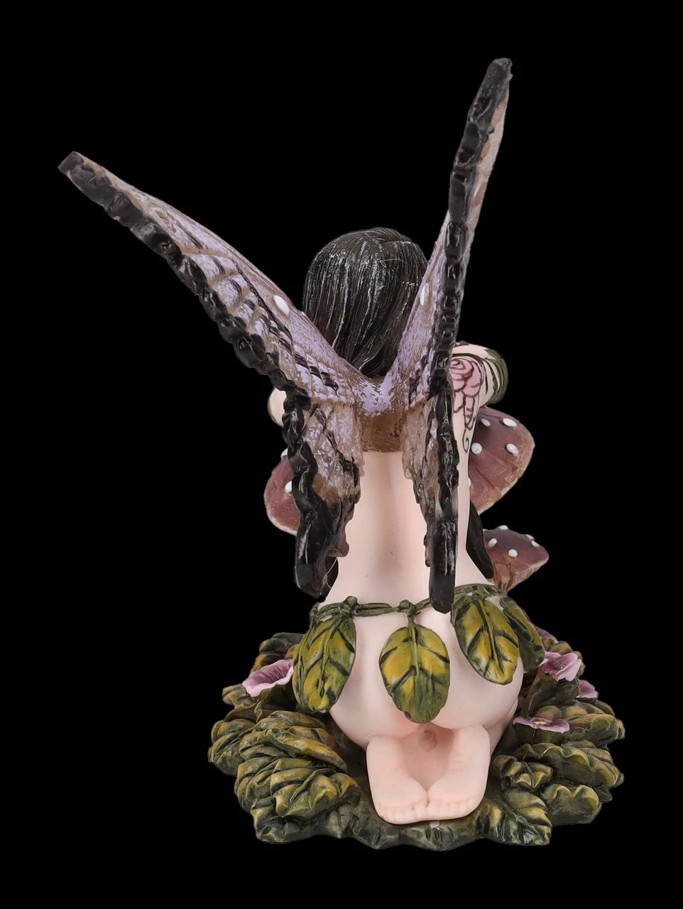 Lediglich mit einem aus Blättern geflochtenen Gürtel bekleidet, kniet die niedliche Elfe Serena auf dem Waldboden und stützt ihre Arme verträumt auf einem Fliegenpilz ab. Das Rosentattoo auf ihrer Schulter, ihr leichtes Lächeln und ihr neugieriger Blick sagen, dass sie ihre Umgebung sehr interessiert und genau beobachtet. Die niedliche Elfe wurde aus liebevoll handbemaltem Kunststein (Polyresin) geschaffen. Die filigranen Flügel der 13,5 cm hohen, 13 cm breiten und 7,5 cm tiefen kleinen Elfe sind zart gemustert. Die hübsche und etwas freche kleine Elfe freut sich auf einen warmen Platz in Ihrem Zuhause, sie ist aber auch das perfekte Geschenk für alle Elfensammler.