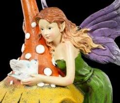 Die bunte, handbemalte Kunststein Elfen Figur ist perfekt für Ihre Frühling- oder Sommer Dekoration. Siana ist im Wald auf einen hübschen Pilz gestoßen und ihr fröhliches Lied hat einen kleinen Vogel angezogen der mit ihr zusammen den Frühling begrüßt.